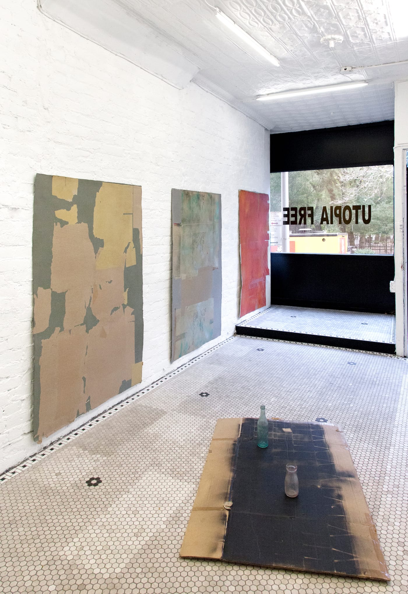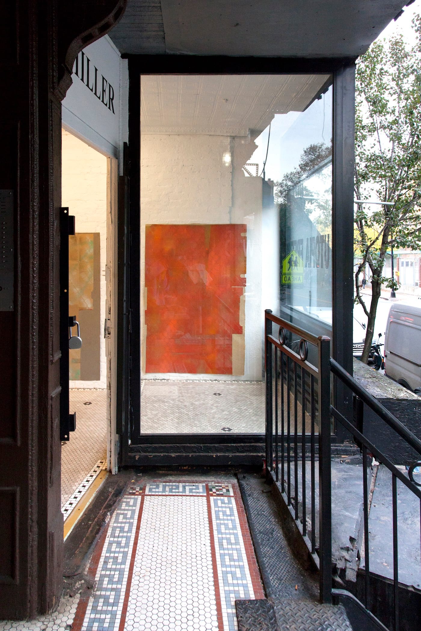 A sequence of images on the Miller Contemporary website documenting Utopia Free pointedly begins with establishing shots of the gallery’s storefront space — two from street level, and one from the top of the utilitarian, steel-and-iron front steps, just outside the door. All three photos feature the gallery’s prominent display window amid the dense fabric of lower Essex Street frontages. As an adjunct (or, for some viewers, a prelude) to the exhibition, these images direct attention to its physical context: a historically residential and commercial mixed-use area