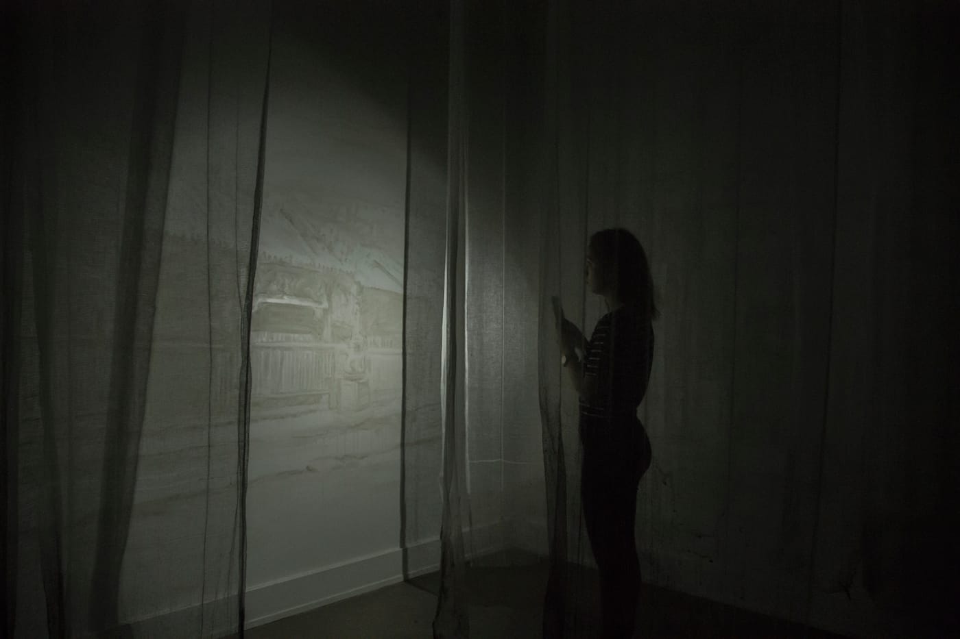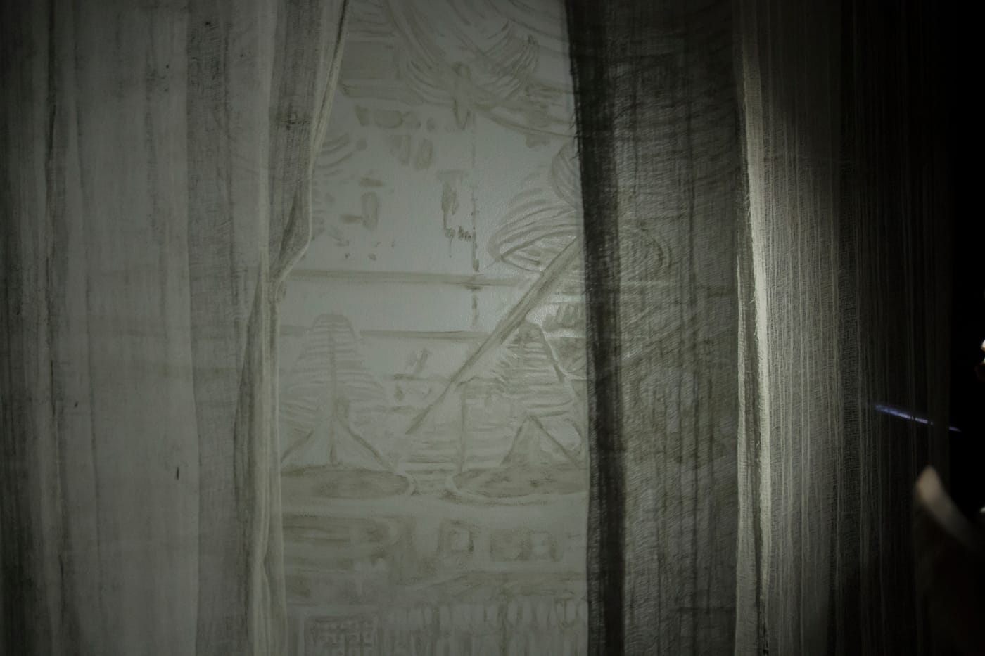 In Requiem, visitors walk through darkened galleries lined with white, gauzy hanging scrolls; wall murals show scenes from San Francisco’s Chinatown, Hong Kong, and the entrance to the Tung Wah Coffin Home — all painted with ash from incense. Light projections of migrating geese play on the walls, and the actual bone box that was opened for Lee is in the back of the exhibition galleries. Lee also commissioned an interpretation of “Pie Jesu” from Gabriel Fauré’s mass Requiem, op. 48, played on the erhu and cello, which is heard throughout the galleries. The overall effect is haunting and moving.
