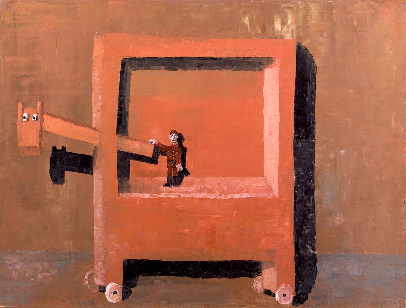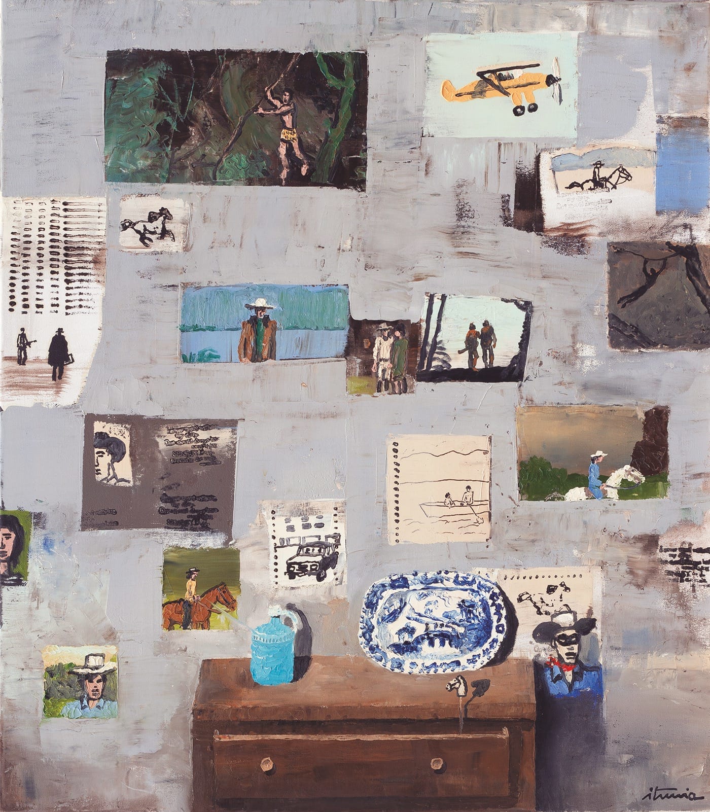 Now the parents of young children, the Iturrias moved back to Uruguay in the mid-1980s, where, before long, Ignacio’s palette absorbed the muddy browns of the Río de la Plata region, turning earthier and darker, a development that seemed to serve his thematic purposes. If his earlier, brighter, rather spare pictures were marked by a metaphysical air, now the currents of memory that had long helped shape his worldview found expression in colors shot through with melancholy, nostalgia, romance, gentle humor, and an abiding sense of curiosity about what makes people tick.