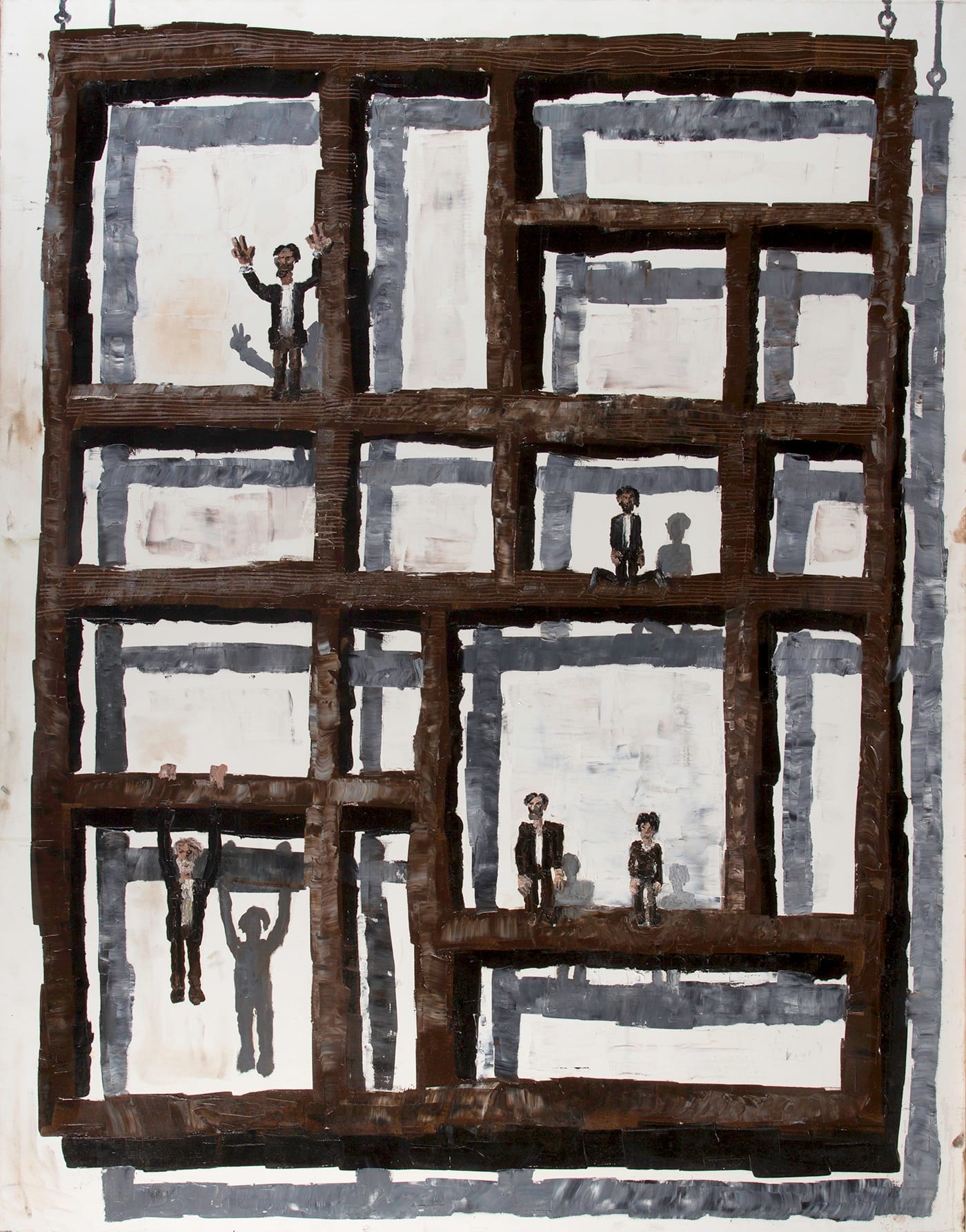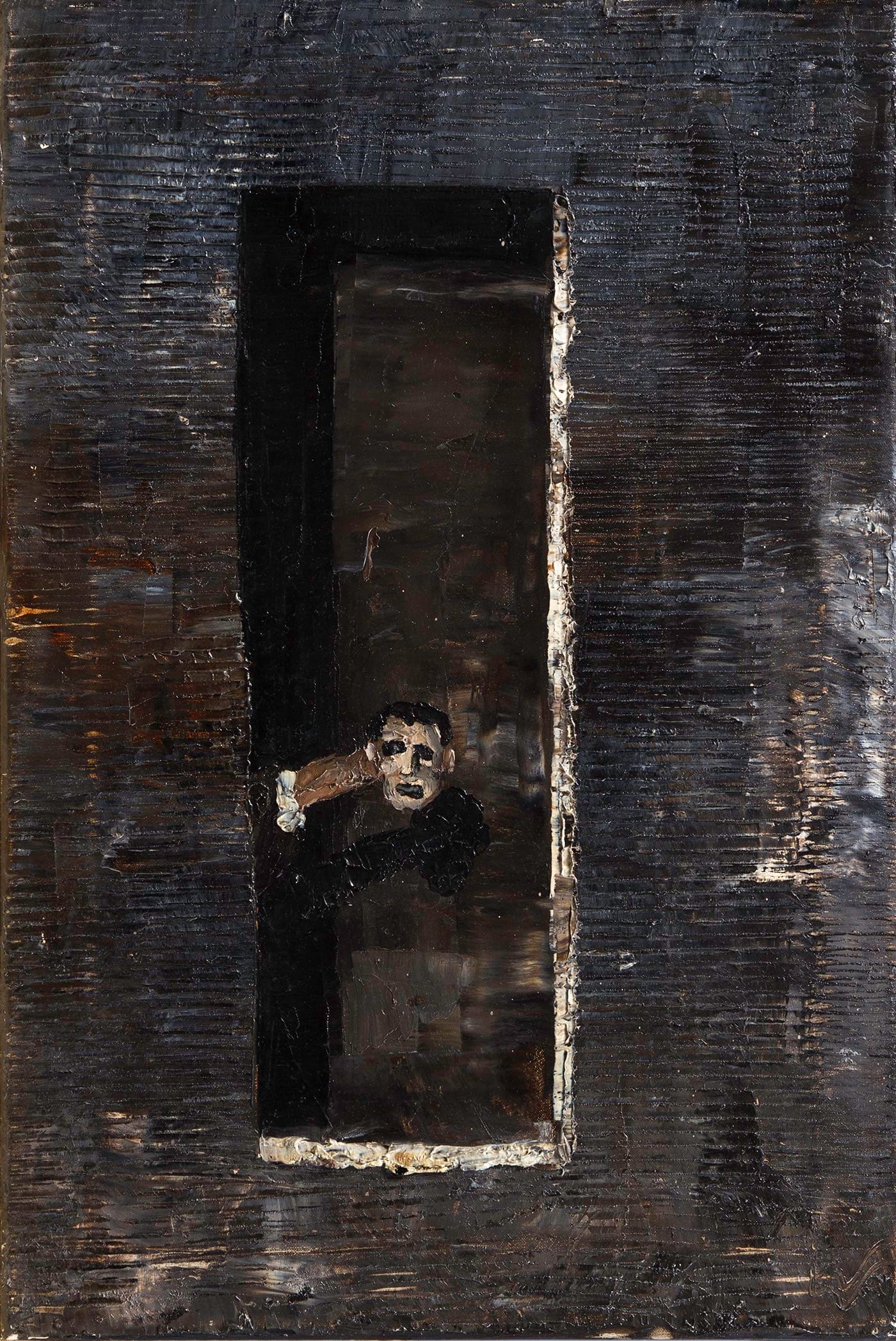 At the Neuberger, this meditative, existential air wafts through such works as “No hay golero” (“There Is No Goalie,” 2012), a picture of pictures (page spreads from the artist’s illustrated notebooks), and “Hola” (“Hello,” 1994), in which a man with a long, giraffe-like neck peeks out from a shadowy window or doorway as if to silently declare, “Look at me! I, too, am here.”