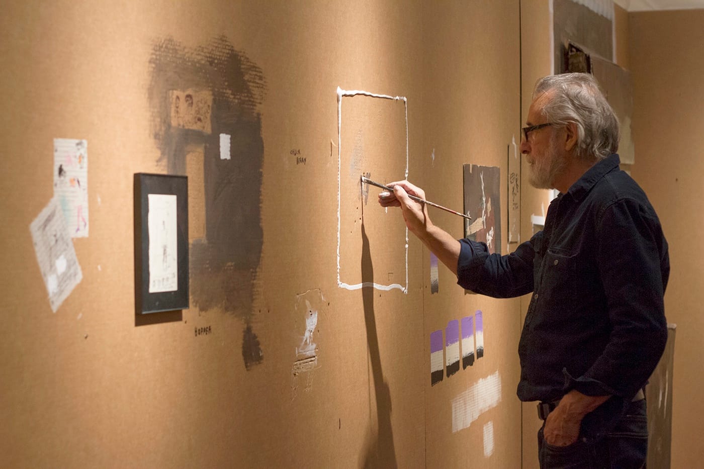 The artist, who had been in residence in Purchase for several weeks, was finishing up one of the most unusual aspects of this current exhibition, which features works made from the early 1990s through more recent years: he had been making art on site in a specially outfitted studio every day through mid-November. Not only had the artist been present, but his art-making had been one of the main attractions of this uncommon art show, too.