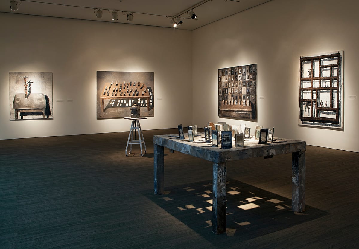 Iturria is fascinated by the plastic — that is, the physical, moldable, sculptural — properties of his materials. Thus, on display are both the painting “La luz de los pozos” (“The Light from the Wells,” 1996), showing a table whose surface is perforated with rectangular cut-outs that pop up to reveal the painted portraits of various men and women, as well as the mixed-media, three-dimensional version he executed of the same subject. “I use what is around me,” Iturria often says. That includes the accidental or unexpected results of his art-making methods. Here, one of them is the light that passes through the holes in the table, creating a play of abstract shapes on the floor beneath it.