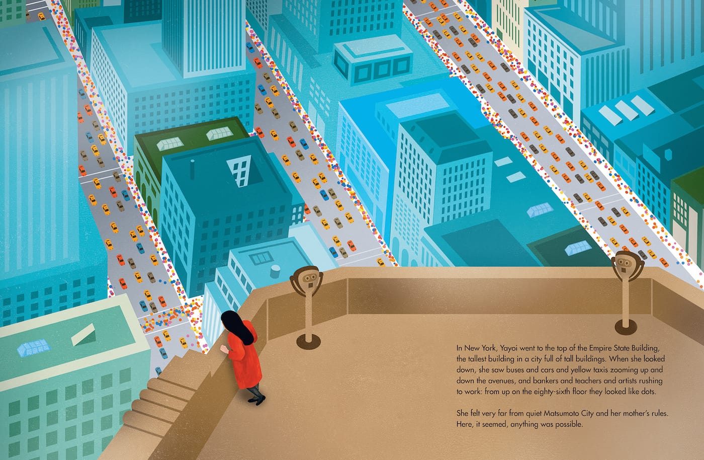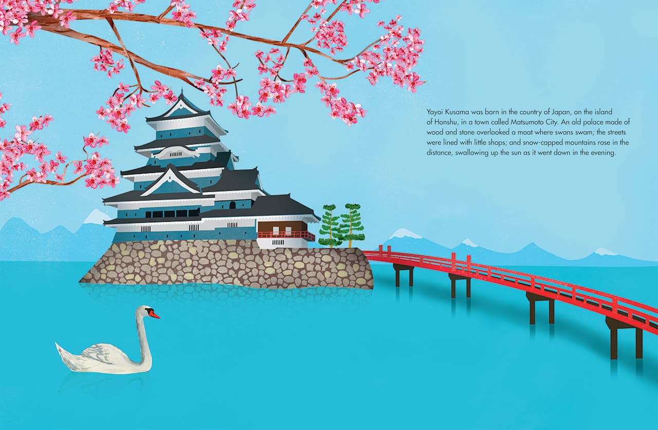 Much of the success of Infinity stems from its masterful illustrations, which are inspired by Kusama’s style but don’t parrot it. Weinstein works in the language of visual repetition from the first page, using the stones beneath a temple in the Japanese city of Kusama’s birth to introduce the idea of small, repetitive pieces comprising a visual whole. Suzuki’s narrative explains that while Kusama’s parents and art teachers wanted her to follow a traditional path in life and in art, she was drawn to representing the world around her on the granular level. Suzuki writes, “She looked closely at the pebbles that lined the riverbed and at the leaves and stalks of plants, and she drew them as chains of tiny cells that looked like dots.” Something as simple as the close observation of nature is radical in this context.