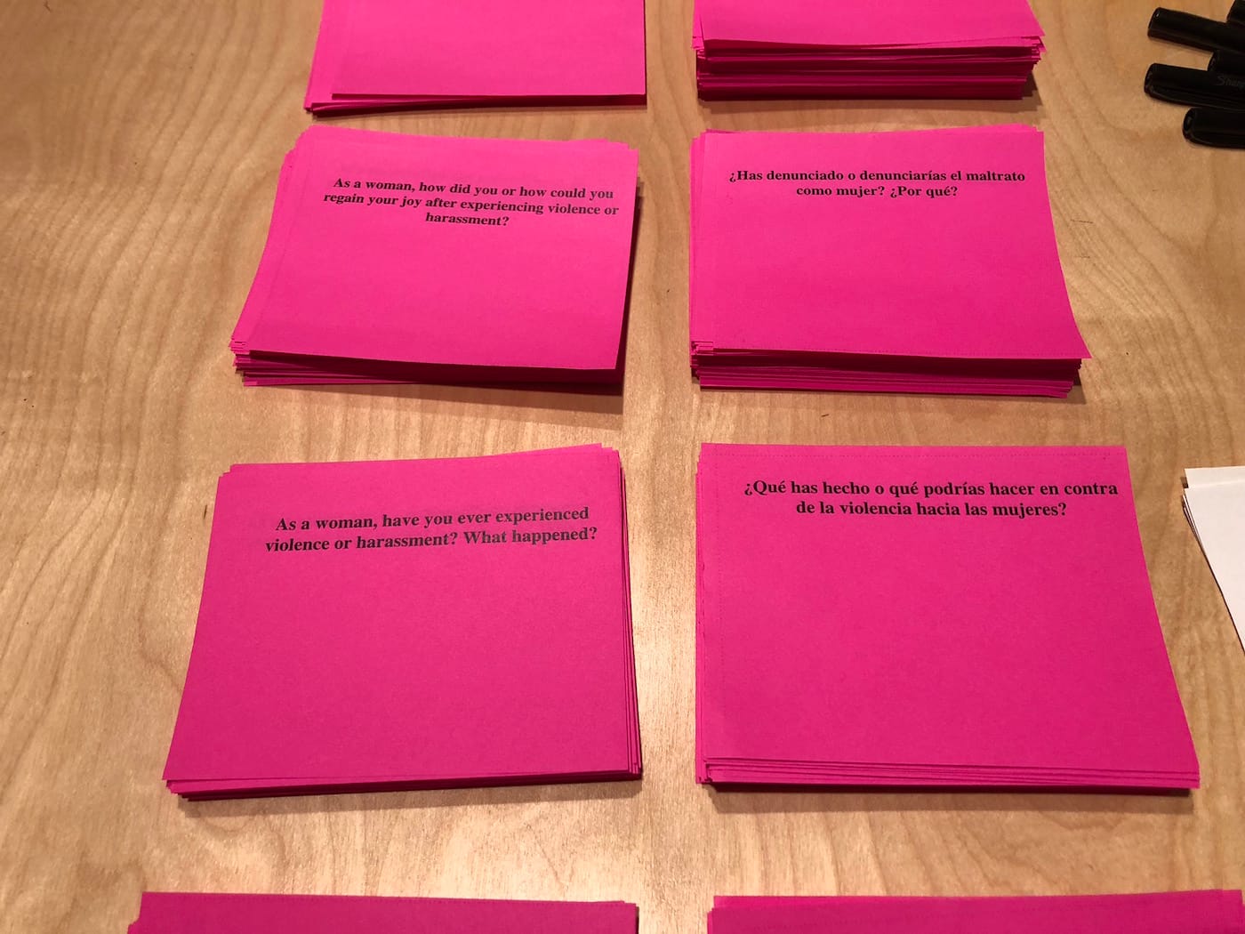 The center of the room holds a table with printed questions and writing utensils, prompting visitors to reflect and hang their stories by clipping their response to add to the clothesline, an act of both catharsis and solidarity. The questions included: What have you done or could you do to stop violence and harassment against women? As a woman, have you ever experienced violence or harassment? What happened? As a woman, where do you feel safe? Why? As a woman, have you/would you denounce violence or harassment against you? Why? And lastly, the question also printed largely and looming over the show, As a woman, how did you or do your joy after experience violence or harassment?