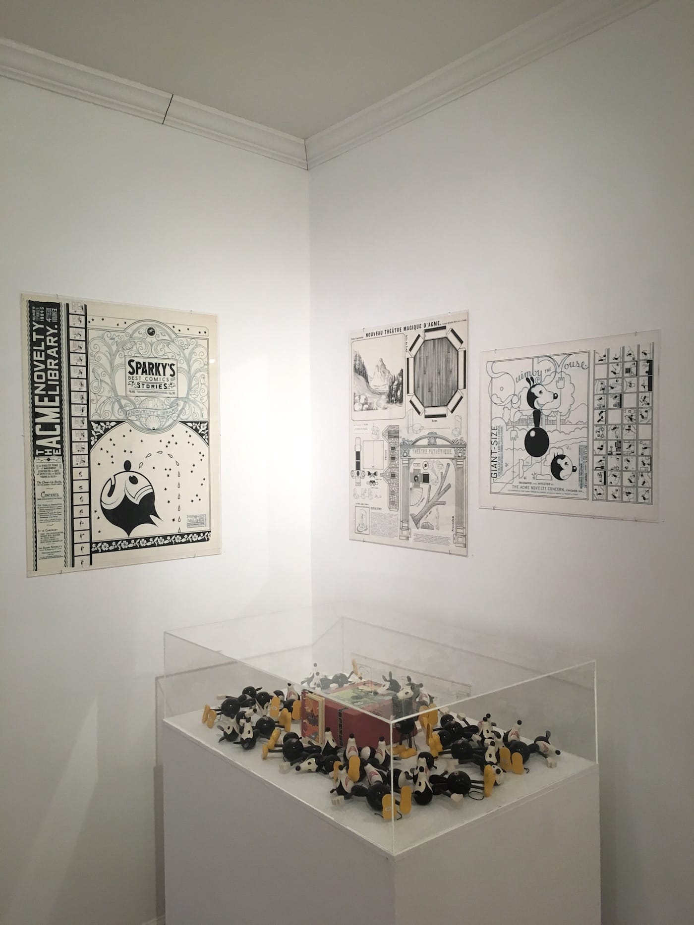 I was, however, mostly disappointed to see that Ware’s current show focuses on his drawings and preparatory sketches. While there are some lunchboxes and limited-edition wooden Quimby the Mouse figures (made especially for the exhibition), I had hoped the show would provide what the book cannot: a three-dimensional engagement with Ware’s especially unique body of work. If anything, the walls should be floor-to-ceiling with drawings, plans, posters, and spreads. Ware should always be crowded and a little bit heavy and uncomfortable, (as I felt carrying Monograph home on the subway trying not to hit fellow riders with the sharp corners).