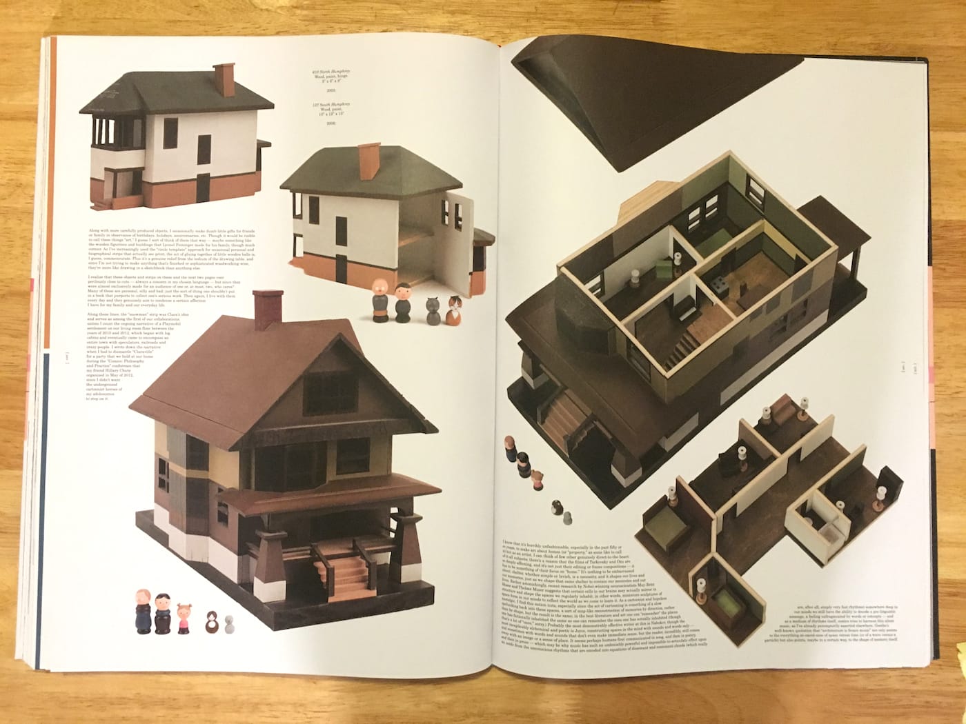 Images of model homes and other container structures, as well as toys and figurines, feature prominently in the book. While in art school Ware stumbled upon the woodshop and asked for tutorials. “What I’d thought would be a one-time visit ended up being the beginning of an education in woodworking,” he recalls, “I wanted to make things the viewer could touch, if not even play around with.” Ware’s books are often of odd shapes or are hefty tomes that require moving around as one reads. But Monograph reveals how many other objects Ware created in addition to his books.