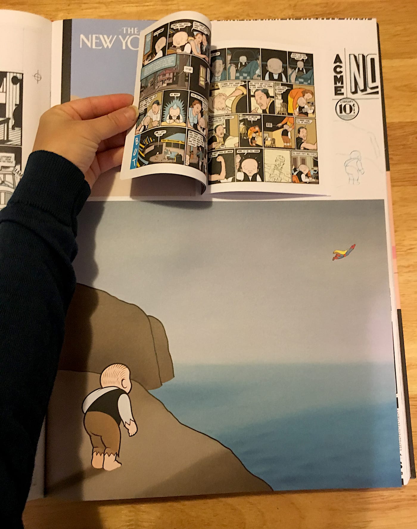 There is a preface by Ira Glass (who has collaborated with Ware on storytelling projects for the New Yorker and This American Life), and two introductions by Françoise Mouly and Art Spiegelman. But the book keeps words to a minimum, always in service to the visuals. Grainy images of Ware as a child in a superhero costume, young Ware leaning over a drafting table, and New Yorker covers twice the size of the actual magazine fill the pages alongside his detailed comics. “As distasteful as I find it to include personal photos in a ridiculously heavy book already awash with words and pictures about me,” writes Ware, “I admit I’d be interested in such photos if the book was about anyone else.” If you squint, in the margins along the edges of these pictures is the meat of the book: Ware’s typed annotations and insights upon revisiting his expansive body of work.