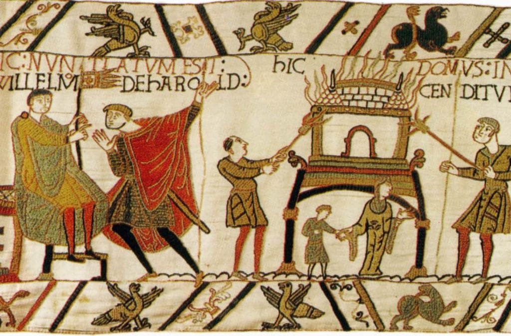 Detail of the Bayeux Tapestry showing a woman and child running from a building set on fire