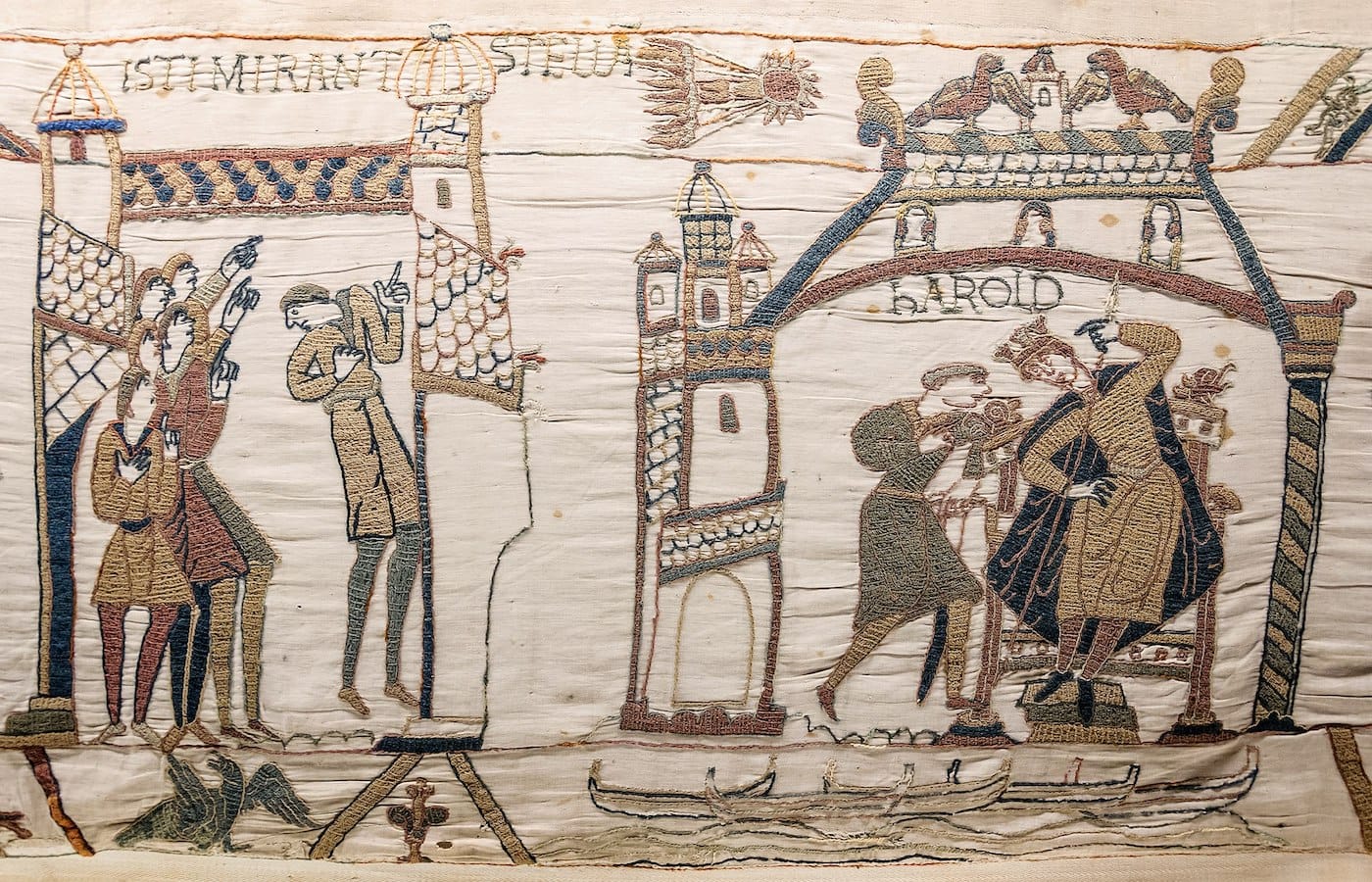 Action-packed, and accompanied by captions stitched in Latin, the embroidery shows the buildup to and violence of the Battle of Hastings, told from the perspective of the Normans. It includes sections portraying soldiers, led by Duke William of Normandy, preparing for battle; crossing the English Channel in dragon-headed ships; and gouging their enemies with swords. Arguably the most famous and debated detail is the moment of the death of King Harold, who had broken his oath to support William’s claim to the English throne. The king appears to be yanking an arrow out of his head, supporting theories that getting struck in the eye was his fatal blow; yet, that stitch work was added in the 19th century, raising questions about how that scene unfolded exactly.