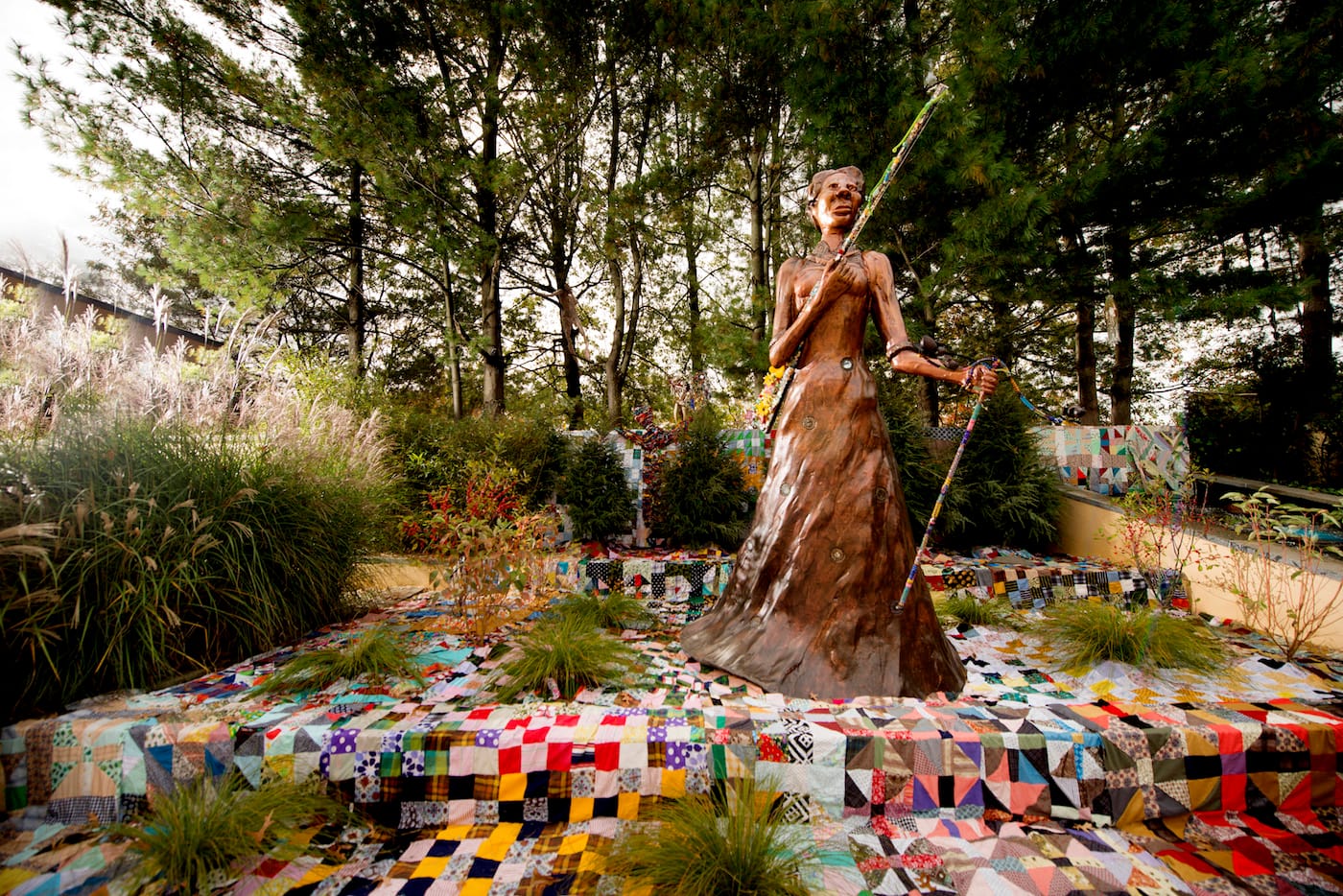 “Harriet’s Closet” continues outdoors with a fiberglass figure made to look like bronze, standing in a sea of quilts and not far from a lynched figure.