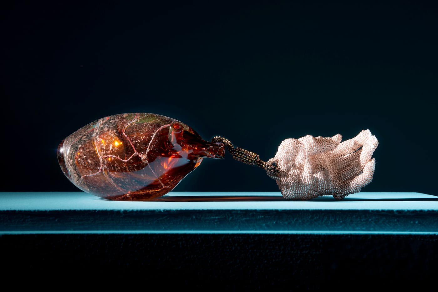 “Harriet Tubman’s Closet” was produced specifically for Grounds for Sculpture. At the center is a beaded quilt spilling out of a trunk. Representations of objects that might have belonged to the abolitionist hero include a beaded hat, a blown-glass rifle with floral details for self-defense, slippers, and a shawl. There is a beaded hand shackled to a heart, showing that her heart was bound to the work she did.