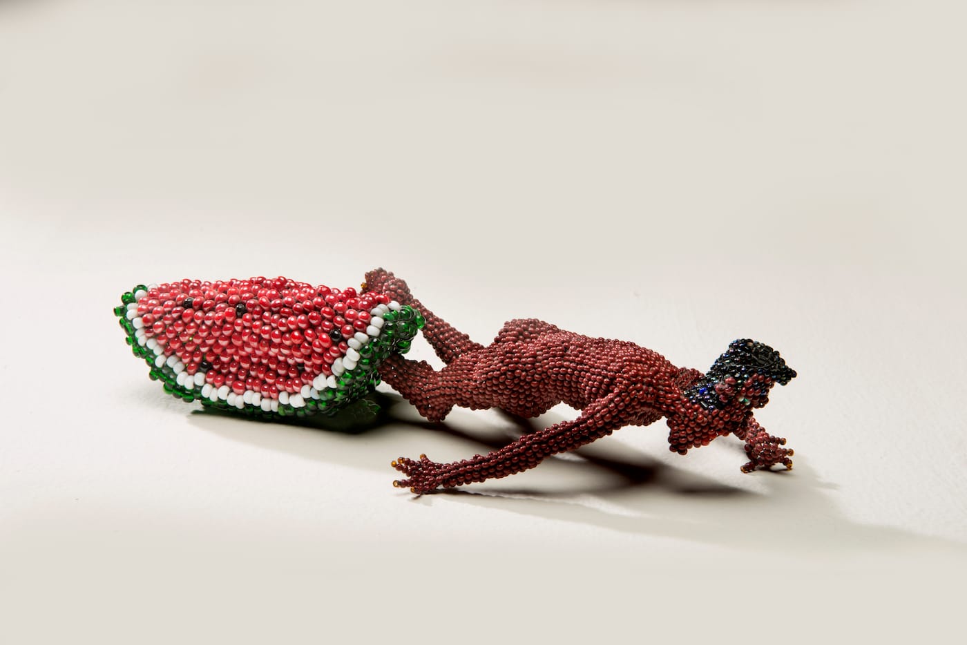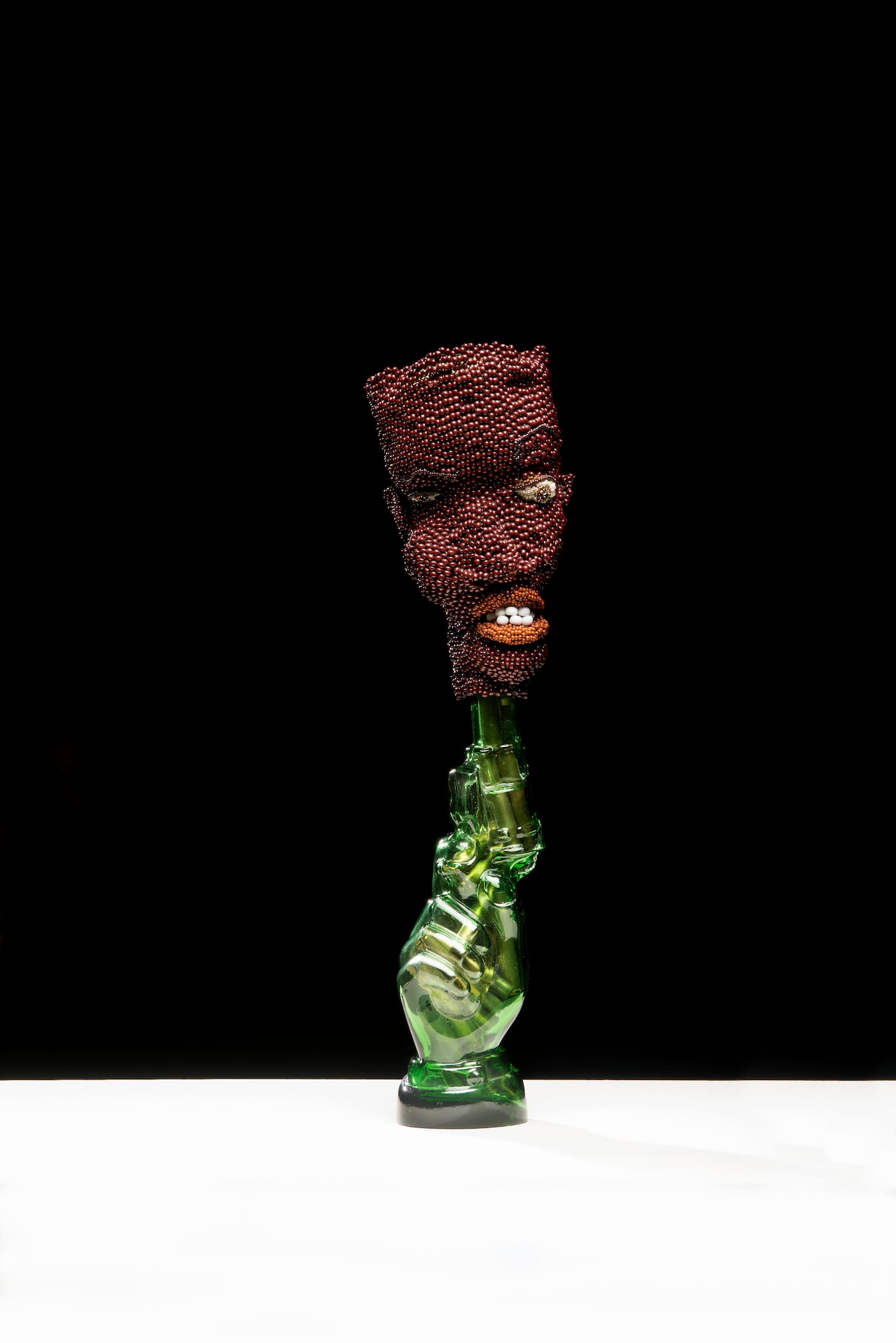 The necklaces on exhibit show her transition from using a loom to employing the peyote stitch, based on the sacred plant, and with beads falling on a diagonal; the three-dimensional technique requires no armature. “These necklaces have narratives,” said curator Patterson Sims. “She makes dark issues palatable. ‘Rodney King’s Head Smashed Like a Watermelon’ takes an ugly theme and makes it beautiful.”