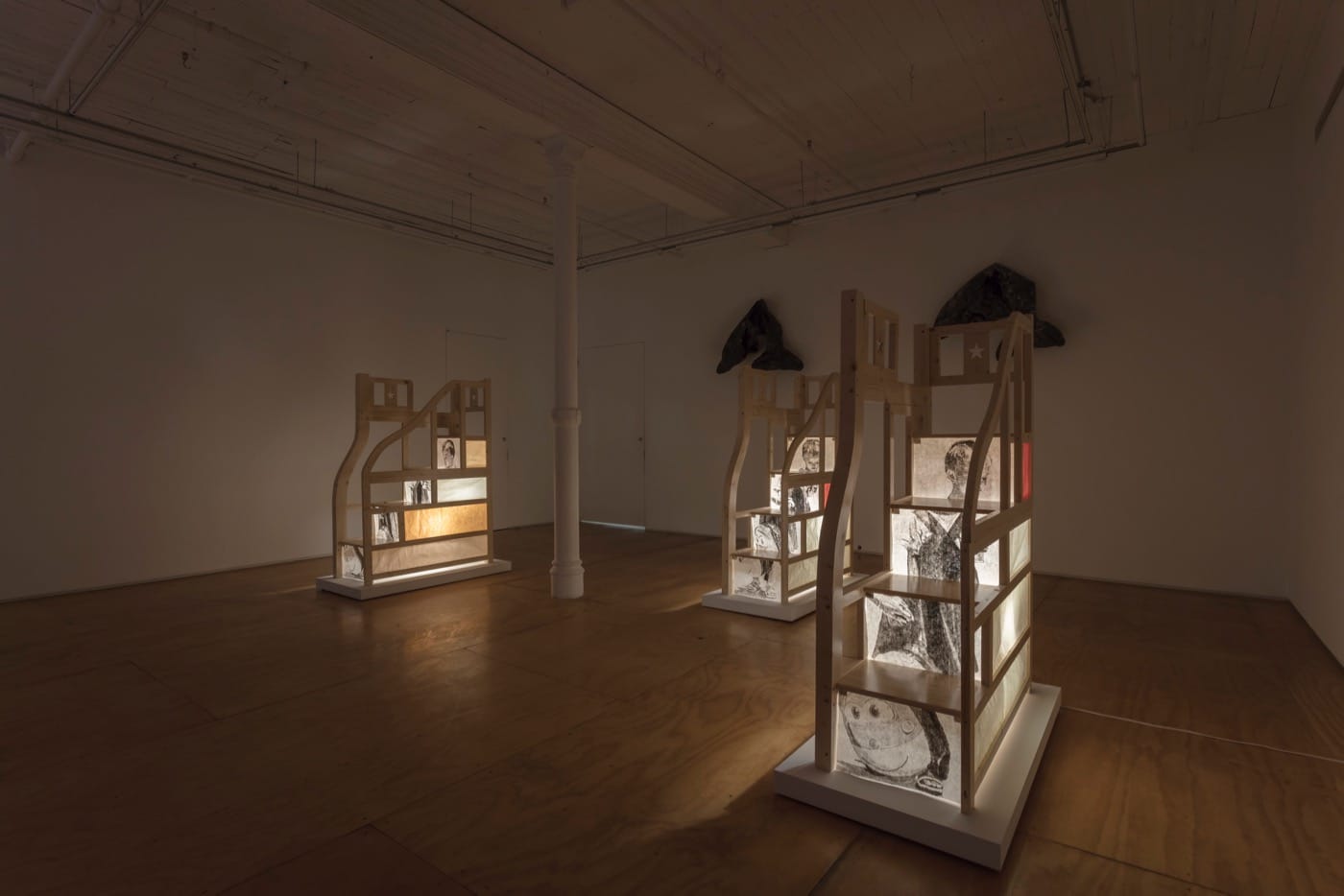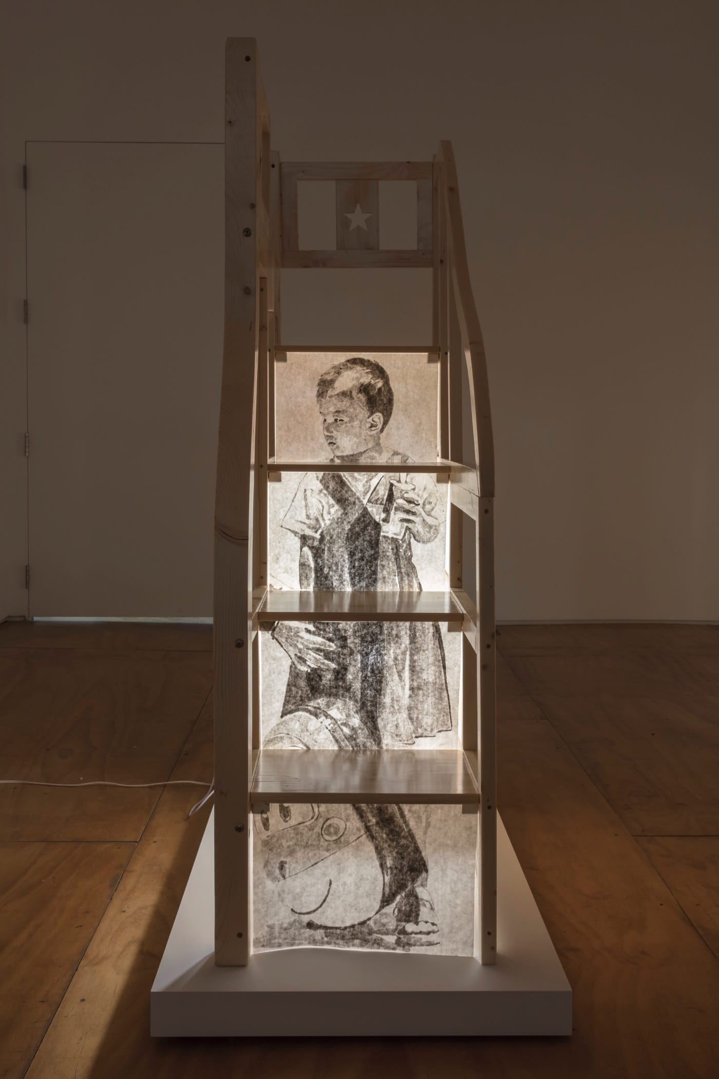 That’s a lot to think about. Three sculptures, each titled “Orphaned,” complicate the artists’ messages even more. For these works, the artists isolated the staircases from the mother-child bunk beds and then inserted still images of the girl from the video in light boxes installed between each step. The child looks trapped within the piece of furniture, her needs subsumed to the greater goal of marketing a product. Walk around each staircase and on the other side, we discover contemporary black-and-white drawings by Lien and Camacho based on works by two other artists, Anicka Yi and Amy Yao. Like the child on view, these art works seem “orphaned,” detached from their creators and not yet embraced by potential future owners. Lien and Camacho seem to be drawing a parallel between e-commerce families and the lot of contemporary artists — both being commodified by a capitalist exchange system which alienates them from genuine connections and more rewarding relationships.