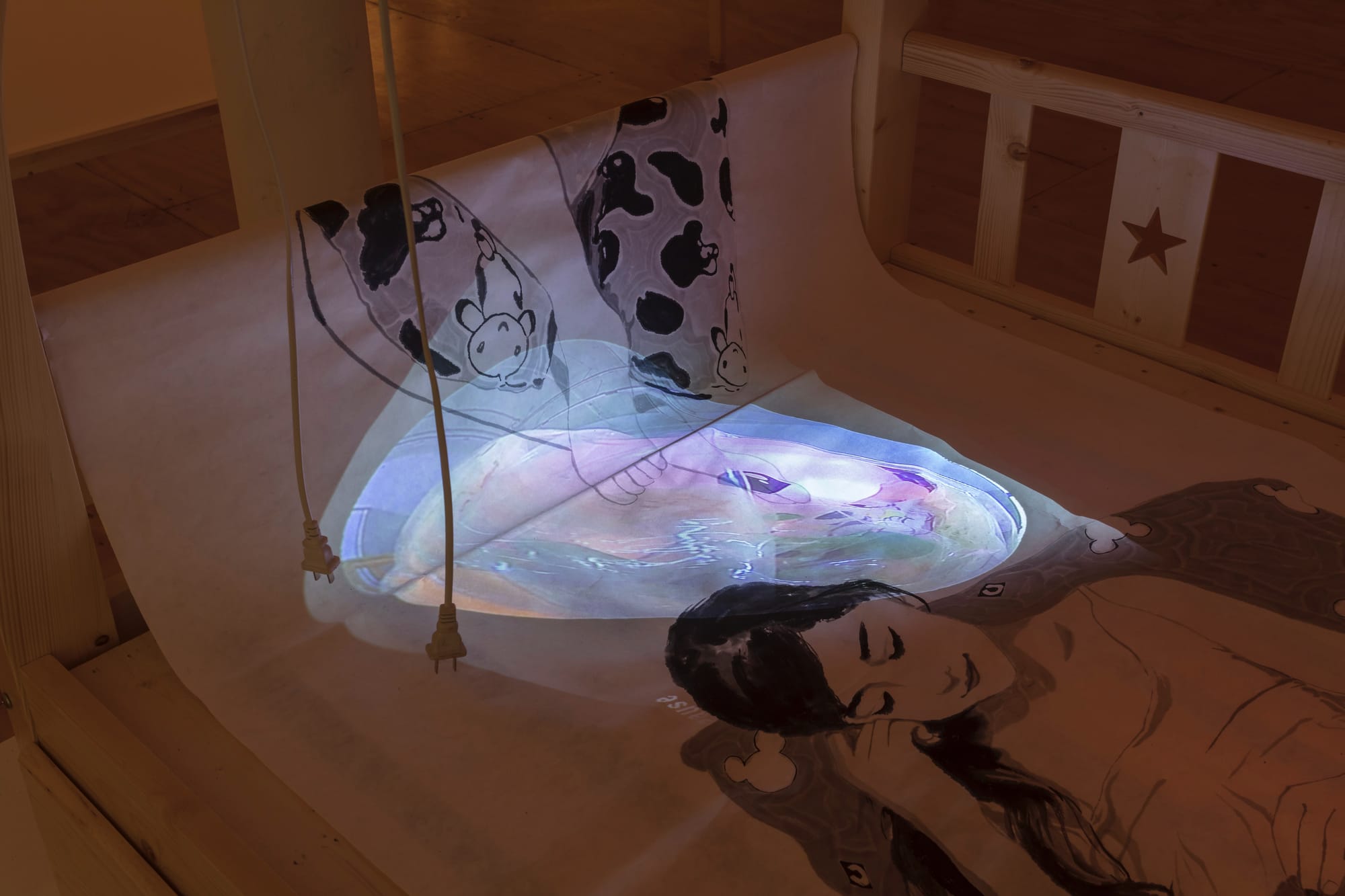 The first object encountered when entering the gallery is a full-scale bunk bed, bought by the artists on Taobao, decorated and outfitted to make a broader point. On the top, various household items and a pair of inflatable dolphins are packaged into two bundles wrapped in plastic like a couple of unwieldy children. Below, instead of a sheet or a blanket, there is a life-size drawing of a pregnant woman hugging a specially designed, u-shaped pillow. Nanny-cams (of the sort used to spy on children and their caretakers) connect the upper and lower platforms, and a video projector splashes images of the goods above onto the bed below. Altogether, the installation presents a disturbing view of the current state of the pressures applied to the mother-child relationship, which can lead to material goods taking the place of intimate interactions.