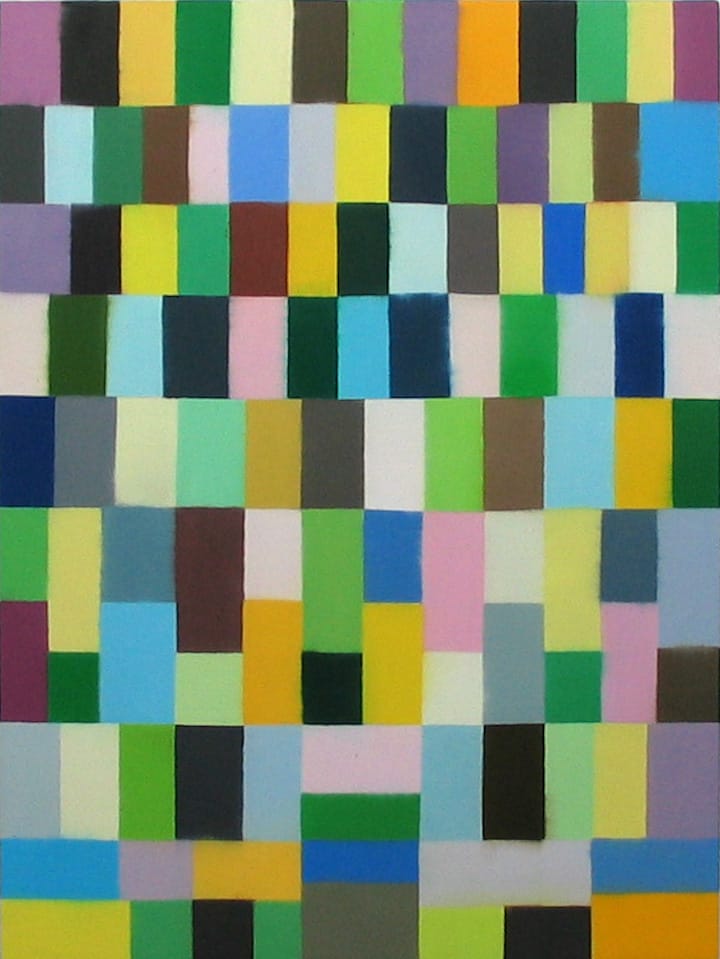 I refer to my current work as having no recognizable subject matter, rather than being non-objective. For instance, there is a stripe painting that was based on Route 203 in upstate New York. It runs through Valatie, where I visited Robert Bordo and Donald Mouton. It was towards the end of summer, and the chlorophyll had started leaving the leaves. There were all these red barns — that special red, and parched grass, and the dusty, gray-black of macadam asphalt. I came home and made a stripe painting. The subject matter is clear to me, but others can’t tell what it is; it’s a secret.