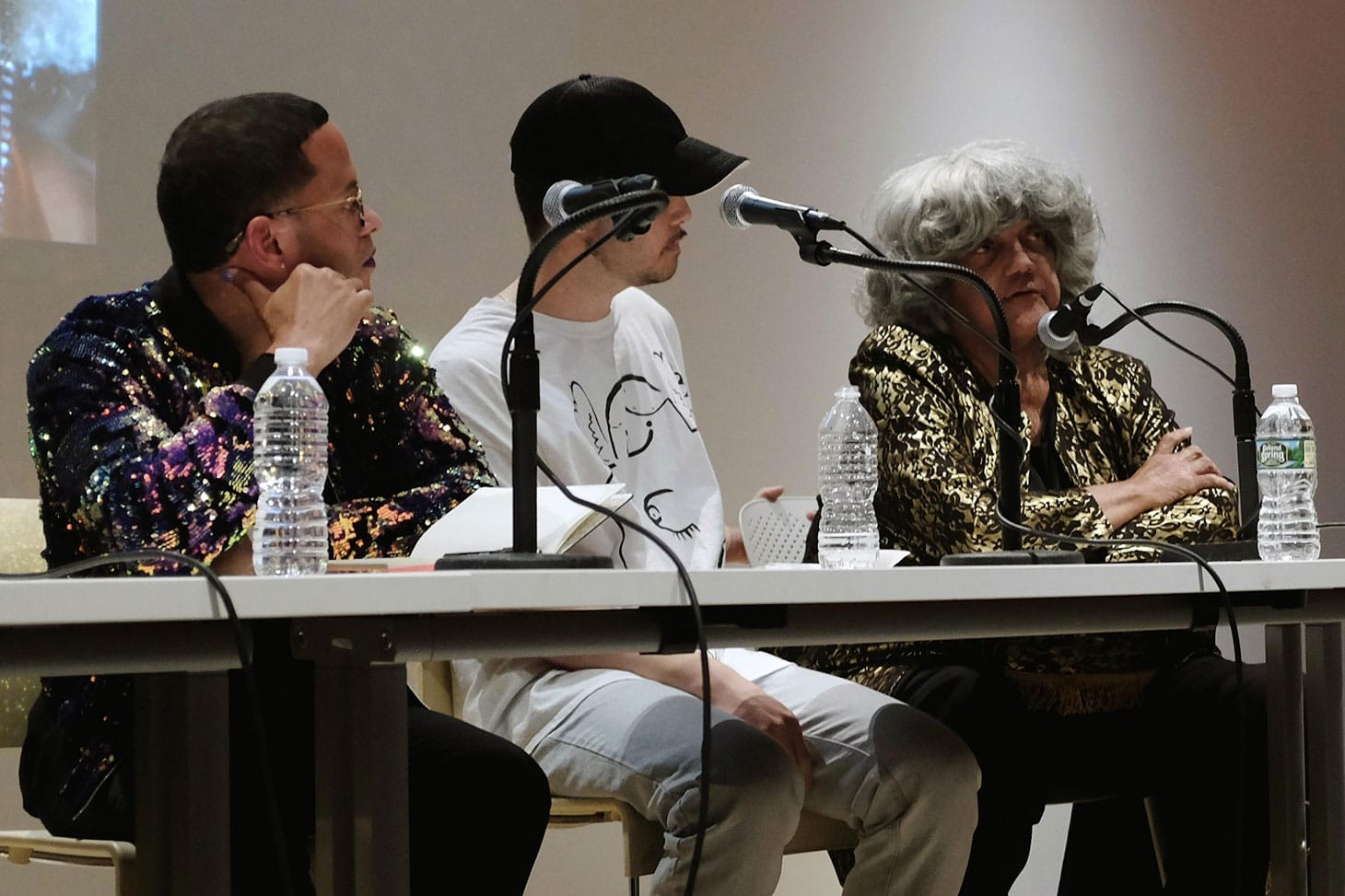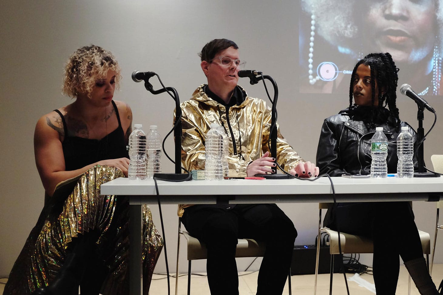 The book is itself a highly visible object, with a cover featuring actress Mya Taylor in her role as legendary performer and activist Marsha P. Johnson from the film Happy Birthday, Marsha! (written and directed by Reina Gossett and Sasha Wortzel) and 448 pages of content ranging from essays to interviews. As such, the politics of aesthetics was a core topic of discussion. Reina Gossett noted that the book, which features full-color artwork throughout, is “insistent in its beauty.” Tying together aesthetics and politics, she pointed toward anti-crossdressing laws in New York City and how notions of bodily control continue in the prison system, where transgender people have limited, if any, control over their gender expression. She noted that, early in her activism, she didn’t think aesthetics had a role to play, but that laws and regulations that control how people dress are in fact judgments on aesthetic appearances.