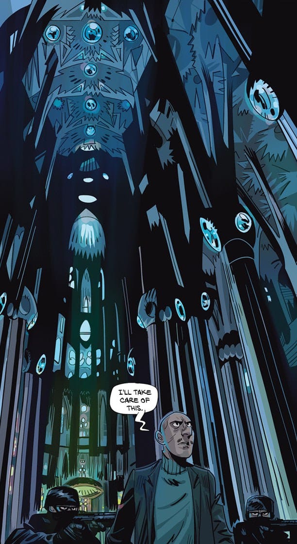 Even when it’s on the pulpy side, the visual violence in The Ghost of Gaudí is imaginative. So are the book’s renderings of Gaudí’s works. The panels are so bright that they’re almost lurid, but they capture the vivid eccentricity of Gaudí’s creations. The daytime exterior scenes are beautifully lit, while the dark interior scenes are hauntingly shadowed. Iglesias is his best when he draws the way Gaudí’s architecture changes under different lighting conditions. And the graphic novel’s final section, a collection of designs and sketches from the creative process, provides a behind-the-scenes glimpse of why and how the visuals developed.