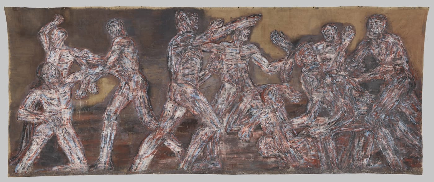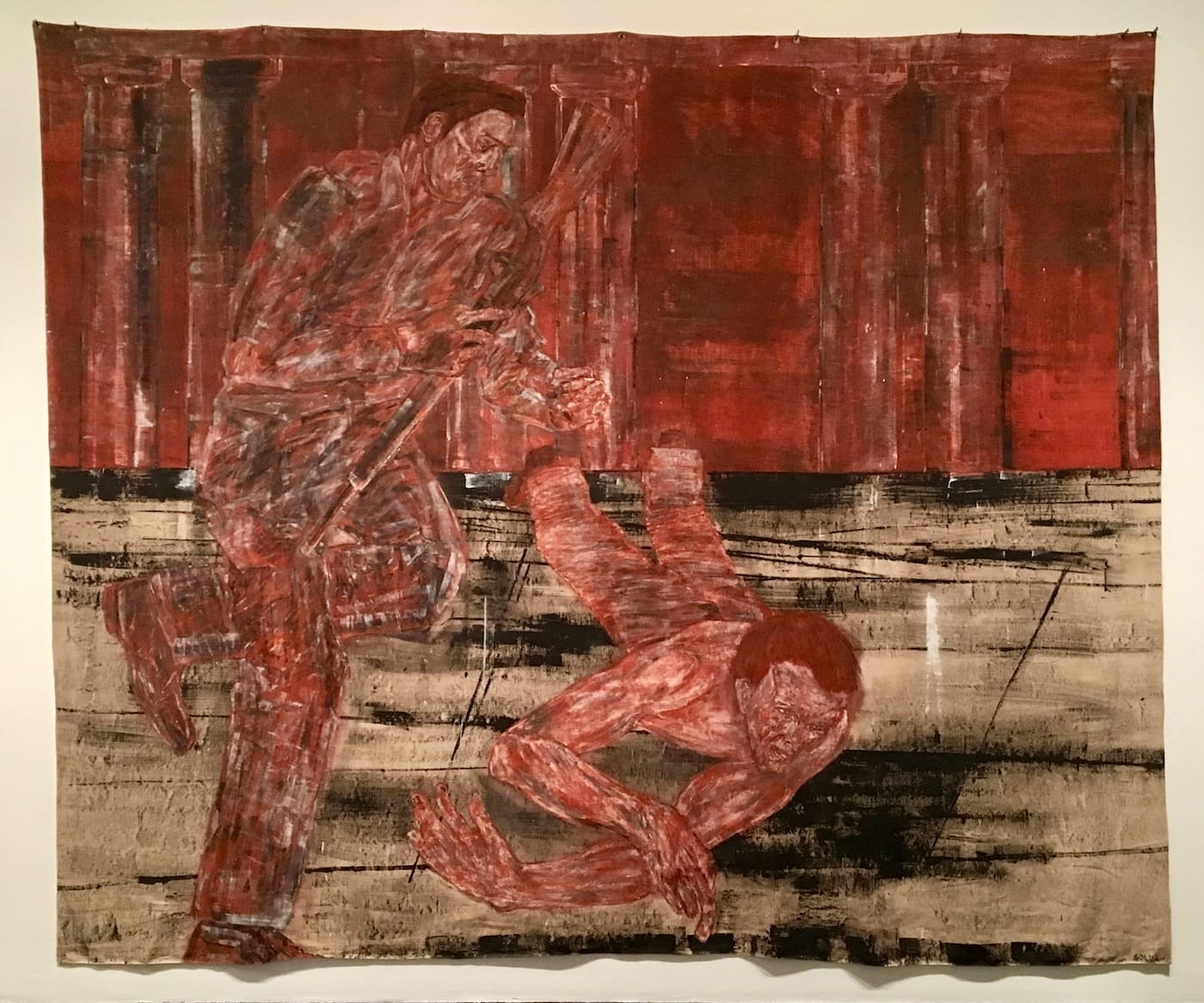 A mercenary wielding a rifle swings back his foot to land a kick on a bare-chested man sprawling on the floorboards. The victim’s plight is underscored by the painting’s formal inventions: horizontal brushstrokes flatten his lower body like a steam roller, while diagonal lines to his left and right cross the floor in reverse perspective, isolating his form and squeezing the space he occupies like a vice. His tormentor, rendered in translucent strokes of red-on-red, becomes a phantasmal presence whose only reality is the kick.