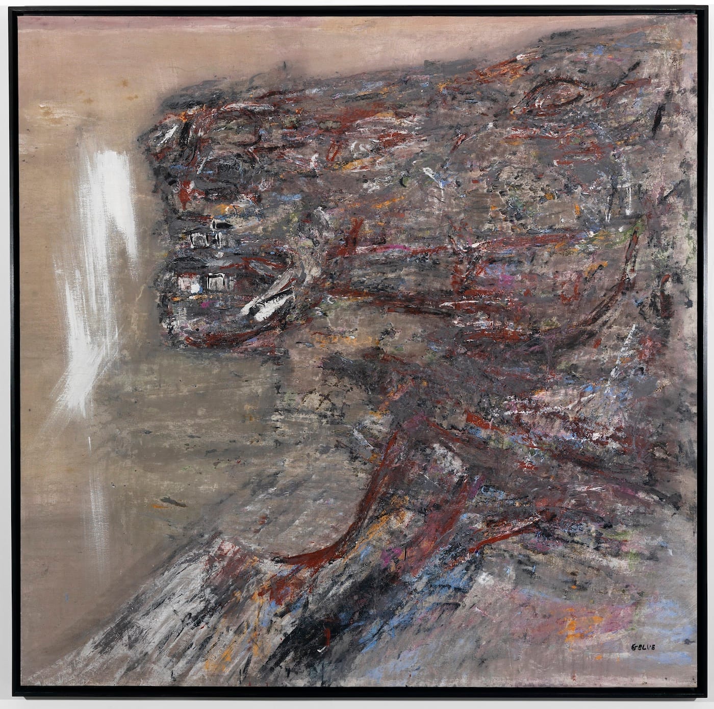 “Dead Bird II” hangs in a gallery with other early works, including a pair of undated etchings of heads that display the same kind of distressed surface Golub would employ throughout his career. The room also features the immensely powerful “Colossal Torso III” (1960) in lacquer on canvas, based on a Roman sculptural fragment, and the horrific “Tête de Cheval II” (1963), an acrylic painting derived from the Hellenistic Gigantomachy frieze of the Altar of Zeus at Pergamon. There is no way that a reproduction of these works could convey their compacted materiality.