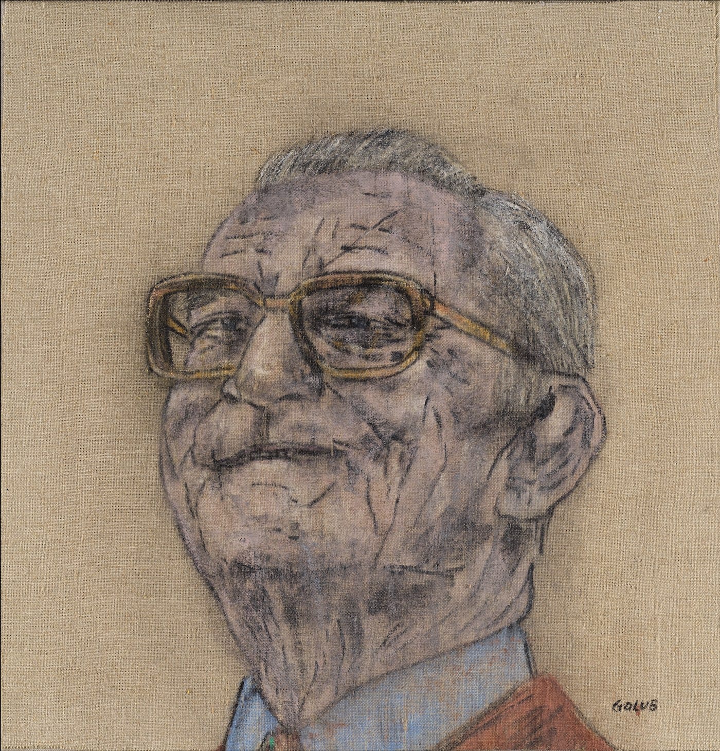 If anything, Golub’s surfaces are worked. His preferred method, until illness in his last years forced him to adopt a more straightforward handling of the brush, was to apply his medium — lacquer in his early work and acrylic thereafter — and then scrape it off, leaving stains and scabs over which he would reapply and re-scrape successive layers of paint. His late canvases are thinly and dryly painted, maculated by streaks and smudges.