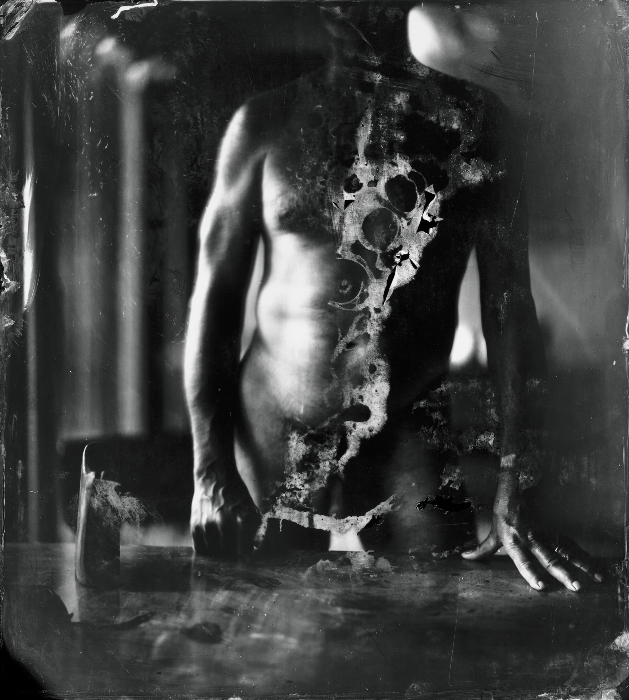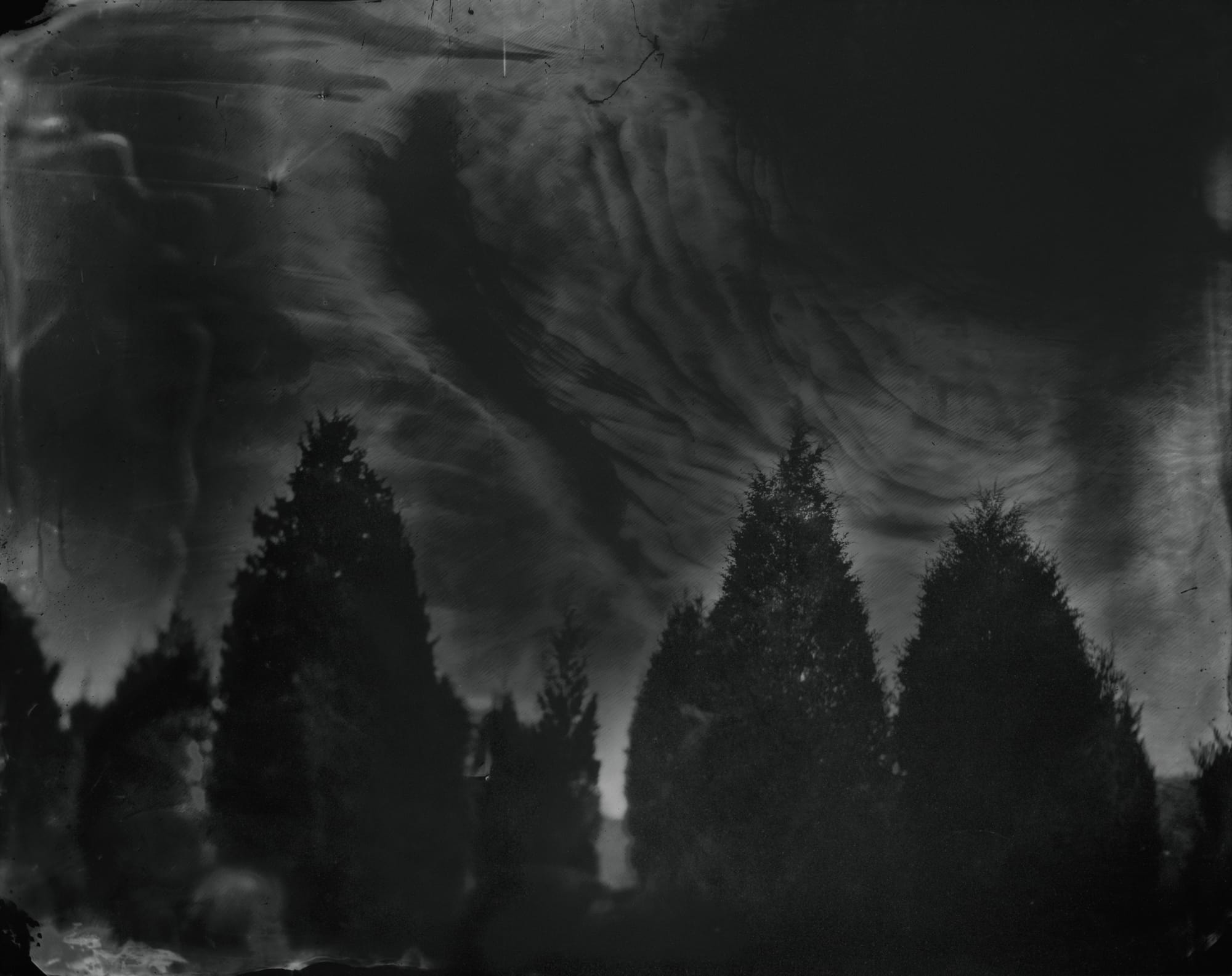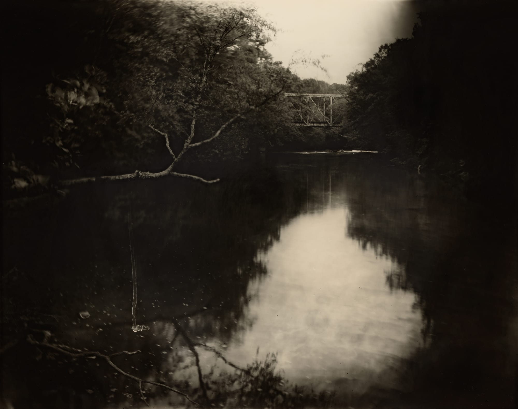 For a 1998 series of photographs addressing the murder of Emmett Till, Mann traveled to Mississippi and created images of landscapes that his killers would have seen in the days and hours before his death on August 28, 1955. In “Deep South, Untitled (Bridge on Tallehatchie),” a chemical streak punctuates the foreground, a spectral teardrop signaling that there is something more to grapple with than the placid, almost Pictorialist tableau that leads the eye to the bridge in the background, from which some say Till was hurled to his death. The picture of the place where Till’s body was recovered, “Deep South, Untitled (Emmett Till River Bank),” is at once as shocking as an open grave and disconcertingly ordinary — an uncommemorated site calling out for a reckoning. An analogous act of pictorial commemoration is evident in the tintypes Mann created a decade later of locales in southeastern Virginia, inspired by Nat Turner’s slave rebellion in 1831.