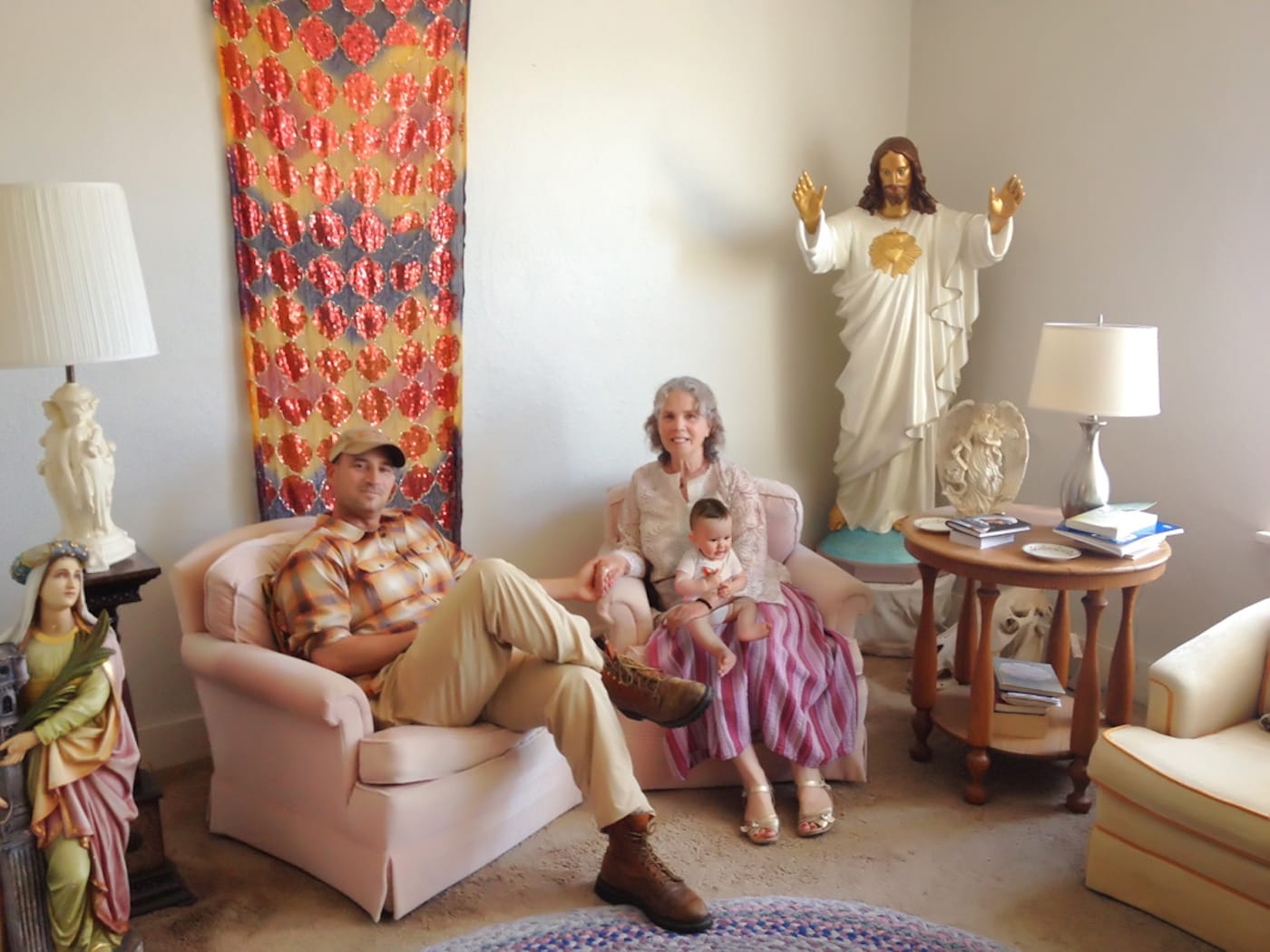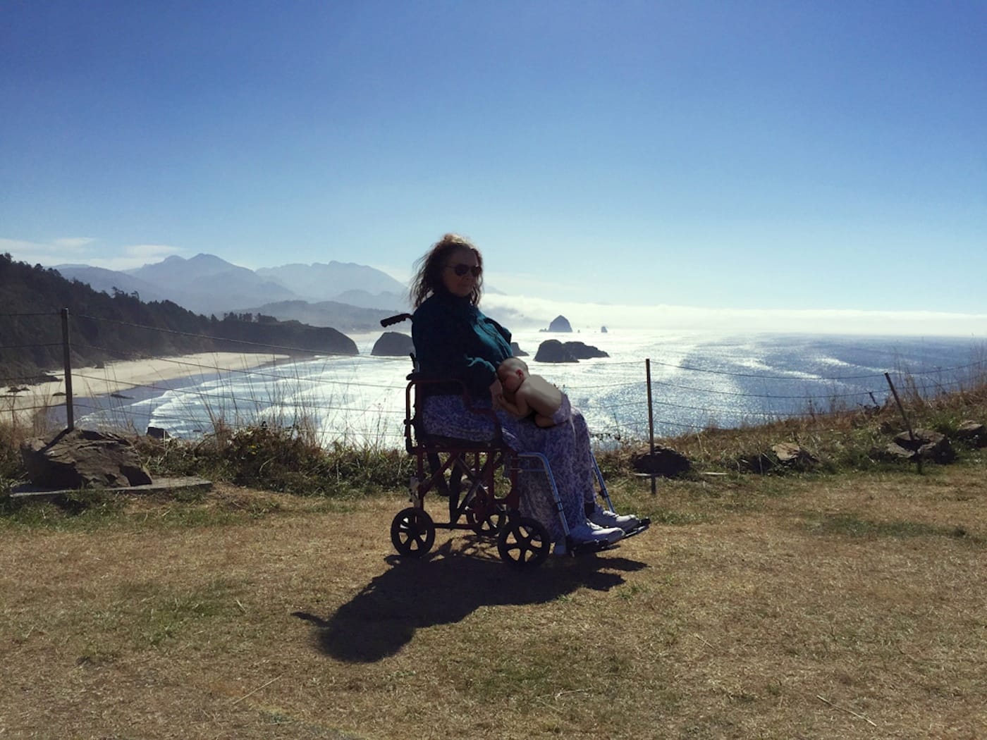 In “The Kingdom” — which is funny (in a weird way) and weird (in a funny way), as well as distressing, eerie, simultaneously tender and cool — the woman ages, with the last photograph showing her in a wheelchair on a promontory overlooking the Pacific Ocean. There are images of the infant balanced on the woman’s shoulders, lying on her lap, or being guided by her hands, but there is never any eye contact between them: they exist in the same and separate worlds. That contradiction, which is more obvious in some photographs than others, stirs up all sorts of feelings and speculations.