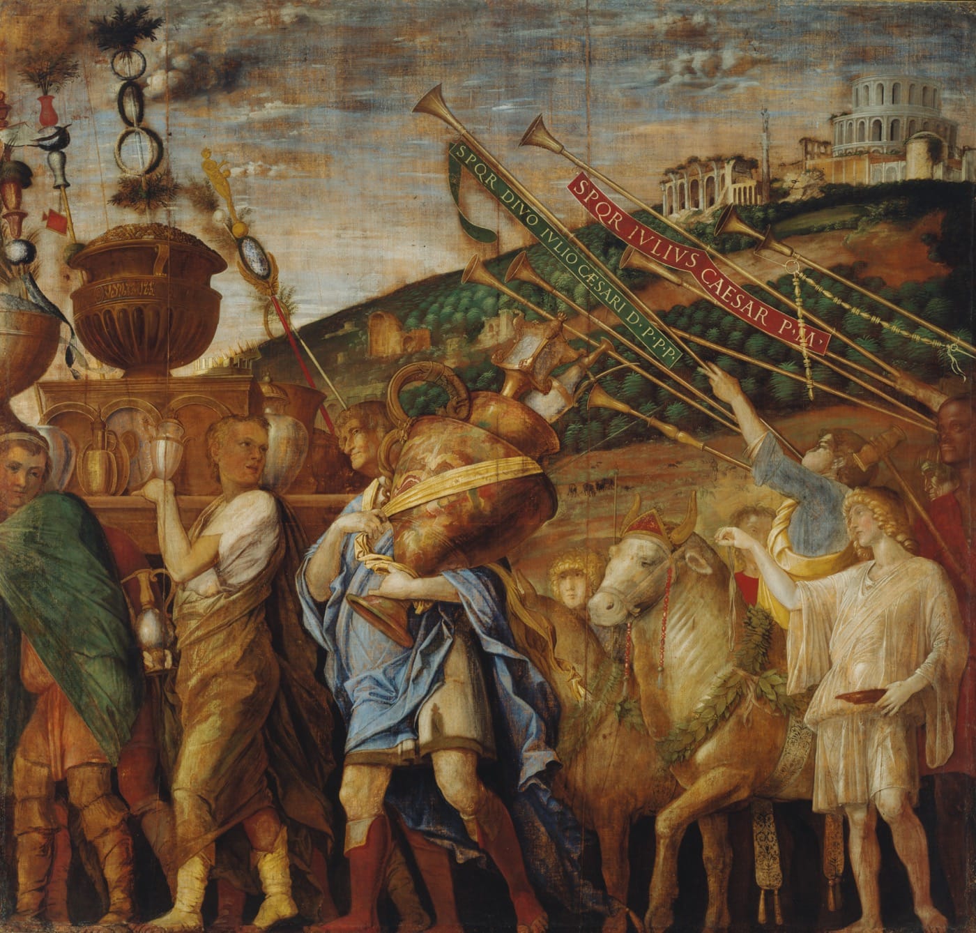 Similarly, the levels of insurance and logistical difficulty involved in the show’s assembly must have been mind-boggling. Remarkable is the presence of the colossal, and colossally fragile, Mortlake workshop tapestries of Raphael’s “Acts of the Apostles” (ca.1631–40) from Mobilier National, Paris, and the entire monumental sequence of Andrea Mantegna’s magnificent “The Triumph of Caesar” (ca.1484–92) which has surely never left its dedicated corridor display at Hampton Court Palace.