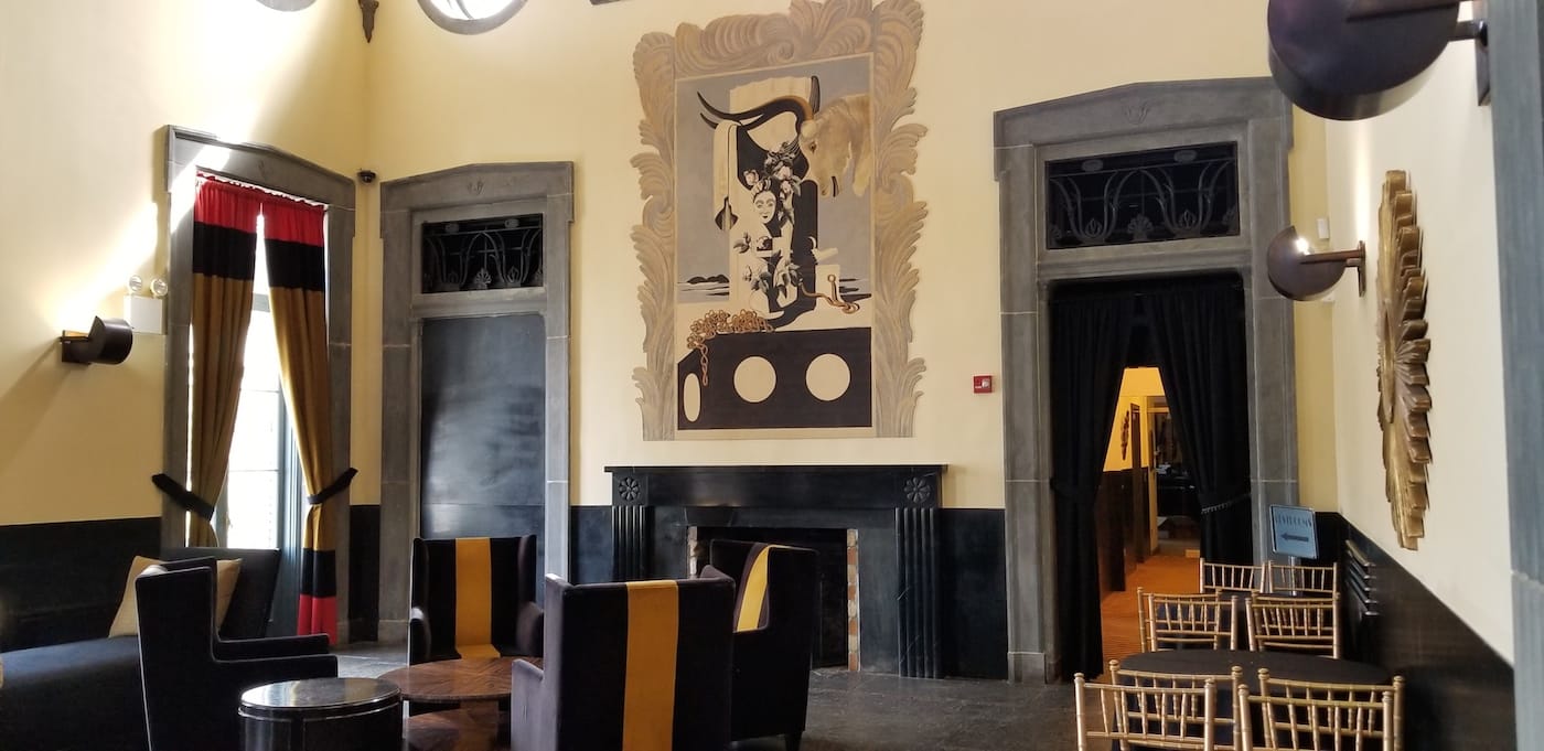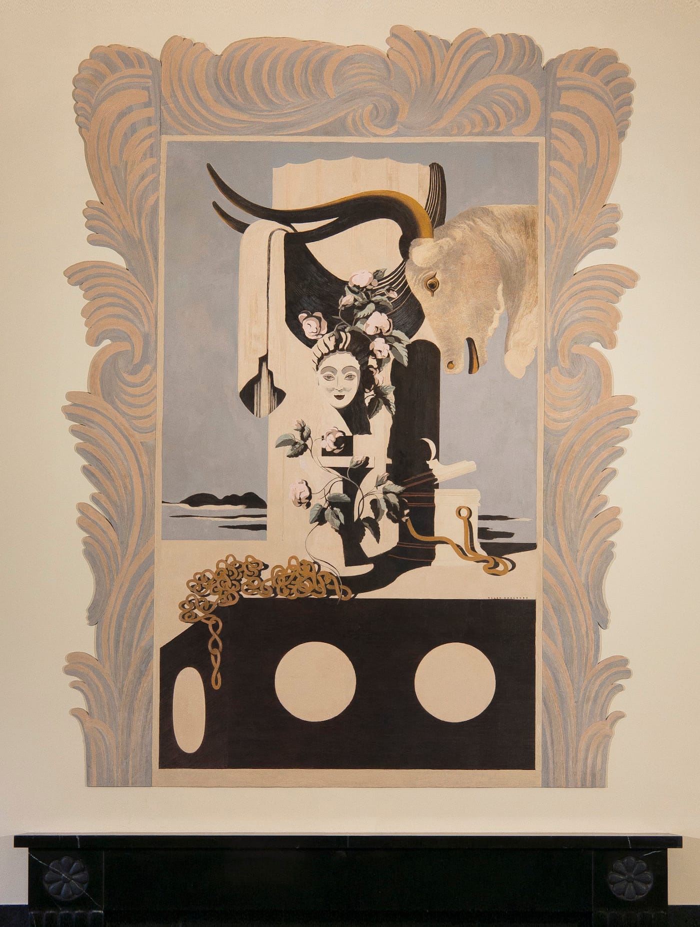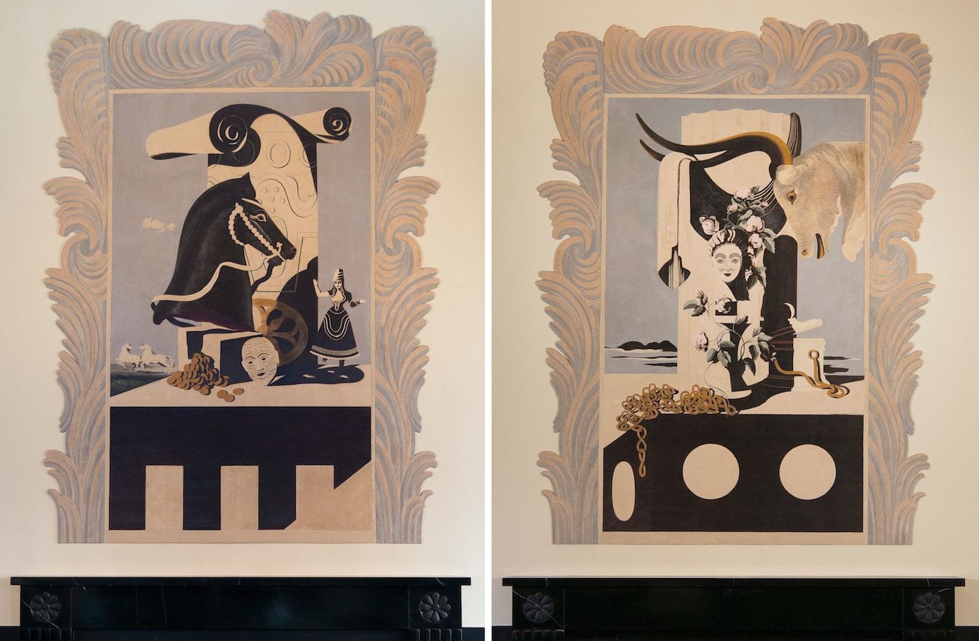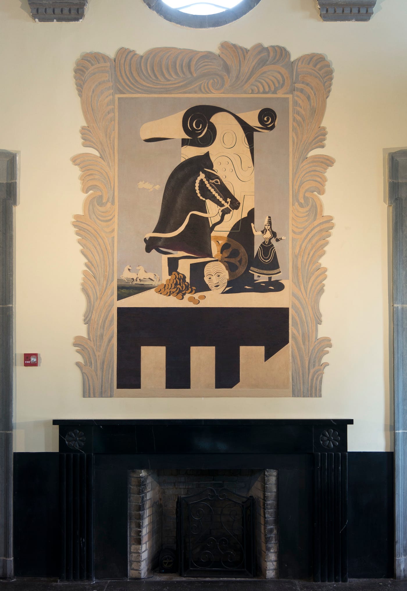 The Split Rock Golf House murals are more modern in their aesthetic, with the collage of imagery surrounded by painted frames with foliage-like flourishes. In one, a pile of coins tumbles in front of a horse head, doll, disembodied head, and decorative tower topped with a scroll, while in the background two white horses run across an empty landscape. In the other, gold chains spill over a dark ledge, and flowers, a woman’s face, and a steer with its horns draped with fabric mingle in front of a column. “They’re more in keeping with the commercial work he did where he’s fusing different stylistic ideas of that time, with Surrealism and late Cubism and even a little Rococo with these plaster undulating areas that surround the panels,” Kuhn said. “It reminds me a little bit of Chirico, with some whimsy thrown in.”