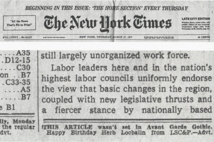 In 1977, when the pioneering graphic designer Herb Lubalin turned 59, his firm announced his birthday in a very public, endearing, and totally nerdy way that could only be for a devotee of type. It bought ad space on the front page of the New York Times and printed one short line: “This article wasn’t set in Avant Garde Gothic. Happy Birthday Herb Loobalin from LSC&P.” The Avant Garde Gothic typeface, then just a few years old, represents just one of Lubalin’s lasting and most famous contributions to design; it’s been been used for innumerable texts, from Twin Peaks‘s opening credits to Wienerschnitzel’s logo.