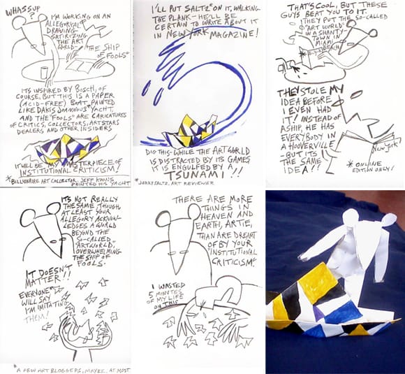 Add Swan to that list of the lampooned. I thought Powhida and the other guy (Townsend) had a brilliant idea with “Hooverville.” I wanted to describe another allegory without going to the trouble of actually drawing it. Also, I recently realized that Powhida had been doing trompe l’oeil drawings of notebook pages long before I started and it appeared I’d stolen the idea, and maybe I had. Dakis Joannou is currently the representative Capitalist for the Capitalized Art World (art bum represents the lower case art world). Saltz is bad for my high blood pressure.