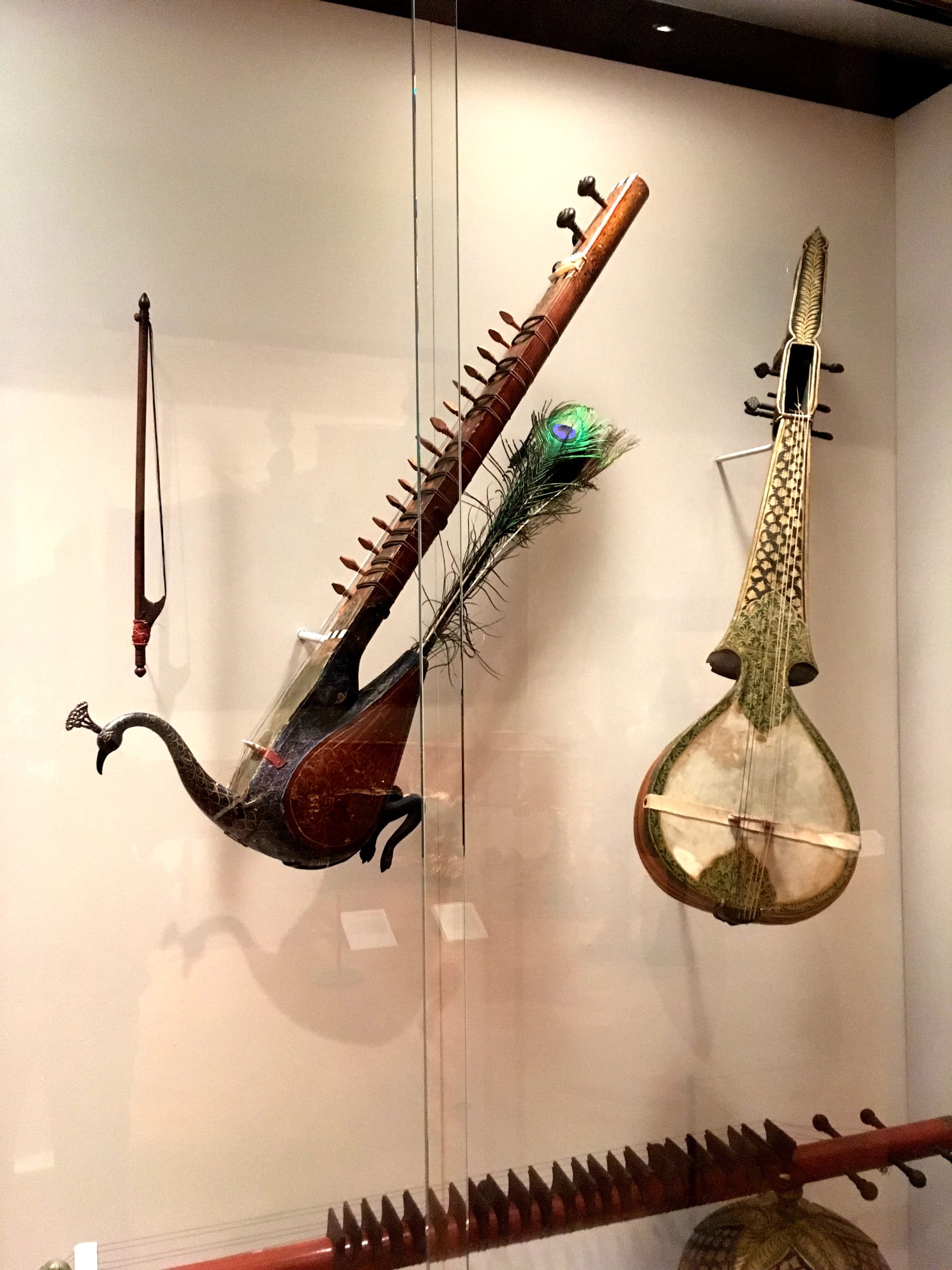 While it’s impossible to do justice to the exhibition without describing at least a couple dozen more of the fascinating and unique instruments on display — the giant pipe organ, Native American whistles, Stroh violin, acrylic saxophone, four electric guitars representing each of the four seasons, instruments owned by famous musicians, the military, hunting, dance, and ivory categories — for the reader’s sake, I’ll end with the one I personally found to be the most visually compelling of all. The 19th-century Indian taūs (mayuri) is a bowed string instrument in the shape of a peacock. Decorated with peacock feathers, it has four melody strings and 15 so-called “sympathetic strings” that drone in resonance. A popular 19th-century court instrument, its peacock shape evokes Saraswati, the Hindu goddess of music.