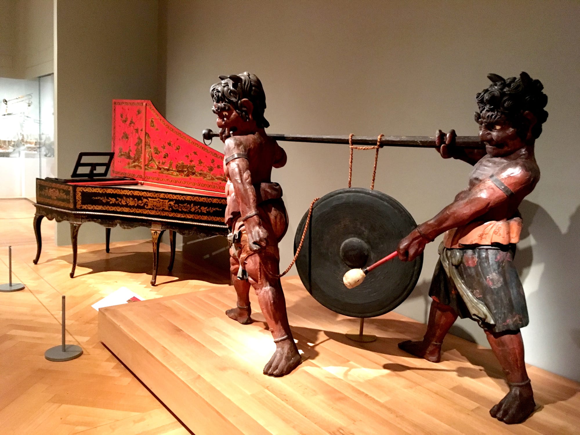 Perhaps the most eye-catching pairing of instruments in the gallery is that of an early 19th-century Japanese gong and an 18th-century French harpsichord converted into a piano. The gong is held by two enormous carved wooden oni, mischievous supernatural creatures in Japanese folklore. “This ferocious sculpture was made primarily as a display piece and possibly to appeal to the European export market,” reads the object label. Meanwhile, the harpsichord-turned-piano is bursting with orientalism, from its red-and-black color scheme to vaguely East Asian-inspired landscapes painted onto the inside of its lid — strangely populated by people playing violas, cellos, and other Western instruments.