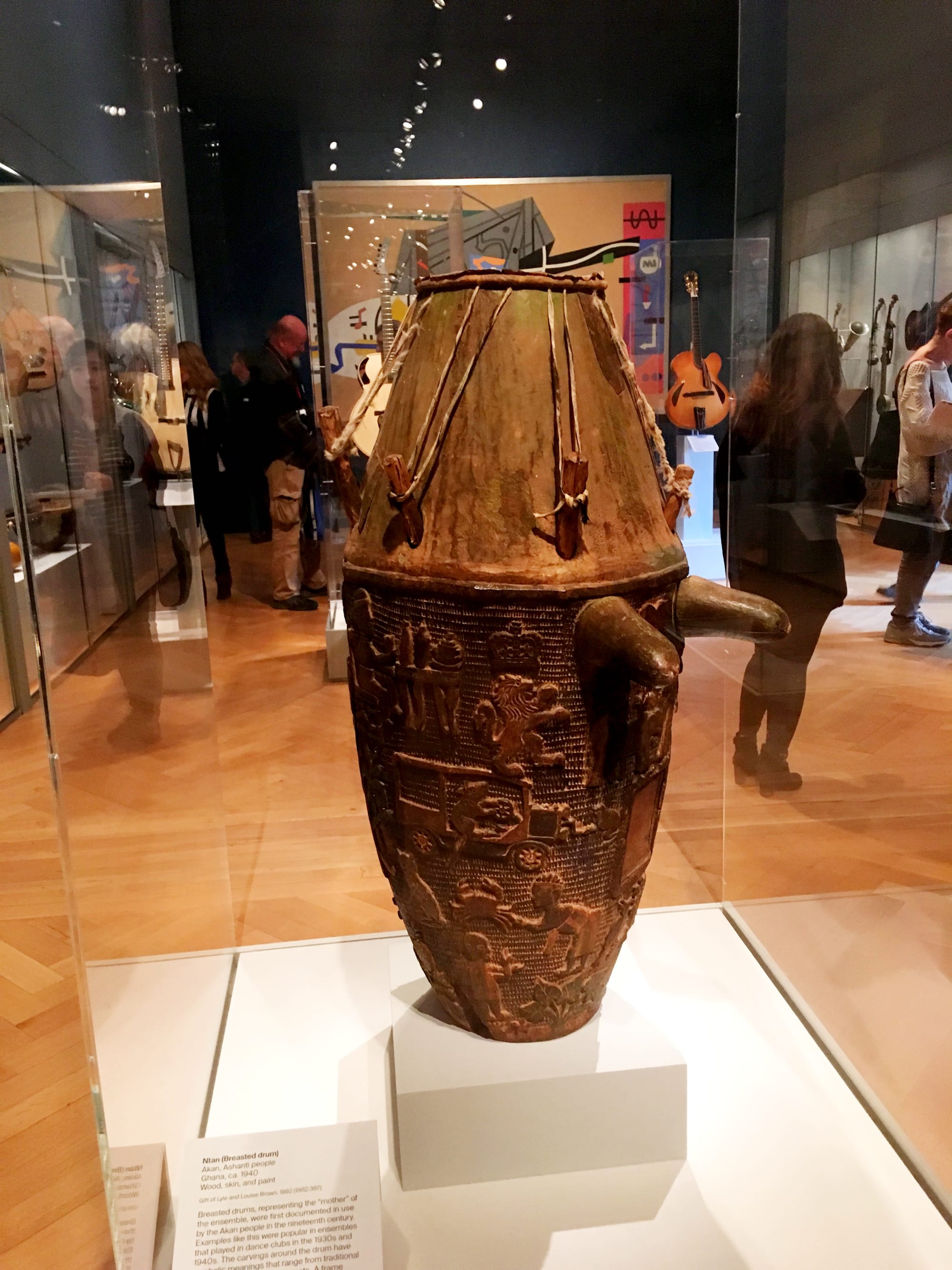 Nearby stands a 1940s Ghanaian ntan (breasted drum), the “mother” of ensembles that often played at dance clubs. Numerous visual depictions of traditional proverbs are carved into the entirety of the drum, as well as political statements poking fun at the British empire and encouraging unity against foreign rule. (Ghana didn’t gain its independence until 1957.)