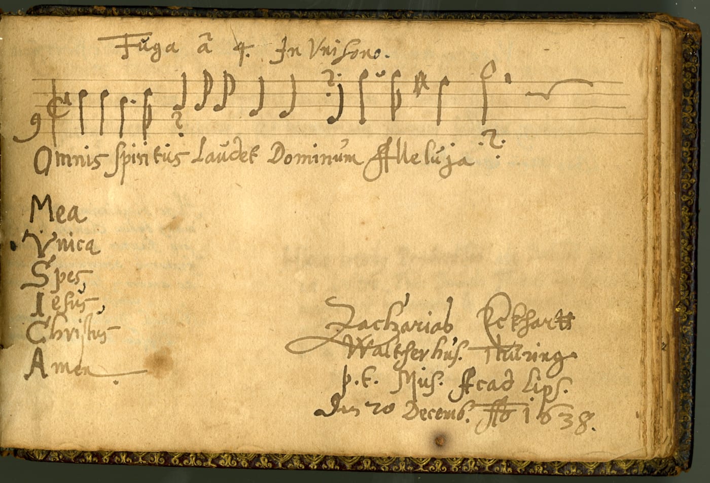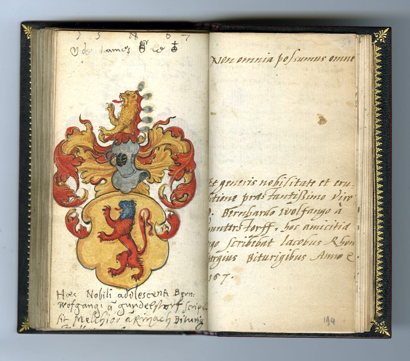 Similar to a yearbook or autograph book, the album amicorum was filled with signatures, personalized messages, and testaments of friendship. Inscribers would include bars of music, song lyrics, illustrations, crests, mottos — the rough equivalent, perhaps, of multimedia elements like YouTube links and photos. Later on, in the 17th and 18th centuries, following the invention of the printing press, scholars could buy friendship books pre-printed with emblems and decorative borders, so signees could fill the templates with handwritten notes and images.