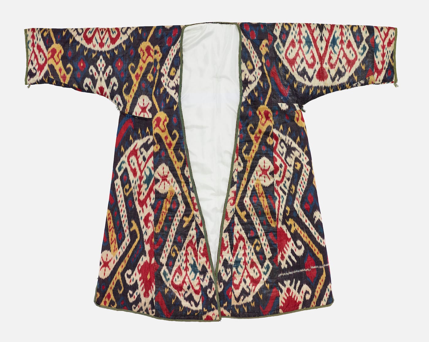 Cut in wide, loose styles resembling those of Ottoman kaftans, the vintage Uzbek coats are striking, with their elaborate patterns and extremely bright colors. They were often lined with similarly vibrant Russian cotton or Indian chintz fabrics, according to Farhad. A silk, cotton, and wool woman’s robe dating to the late 19th century, for example, is a perfect example of just how over-the-top these garments often were: The robe features bold red, yellow, and white diamond-shaped medallions, stylized flowers, and zigzags on a black background, and is partially open to reveal a black lining with red and white flower buds, green leaves, and orange ornamentation — accented with a wide trim of purple and green stripes.