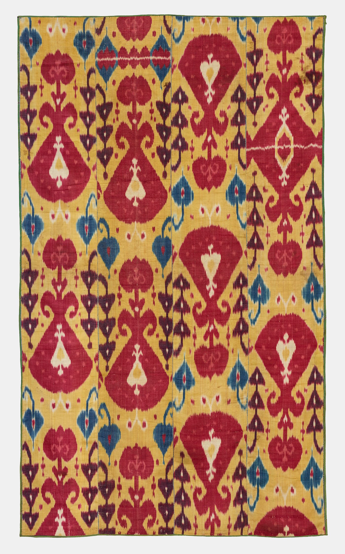 Although the clothing pieces are among the highlights, the wall hangings are also noteworthy. Flat Uzbek ikats served roles both decorative and functional (for example, adding insulation to the interior walls of a house, or as coverings for bedding). They were generally made of several narrow, loom-width lengths of material sewn together, creating another element in the design. An ikat from mid-19th-century Samarkand, featuring large, bulbous blossoms accented by blue and purple leaves on a yellow color field, is a good example. The four swaths of fabric were sewn together in a staggered fashion to create a cascading effect of the floral forms.