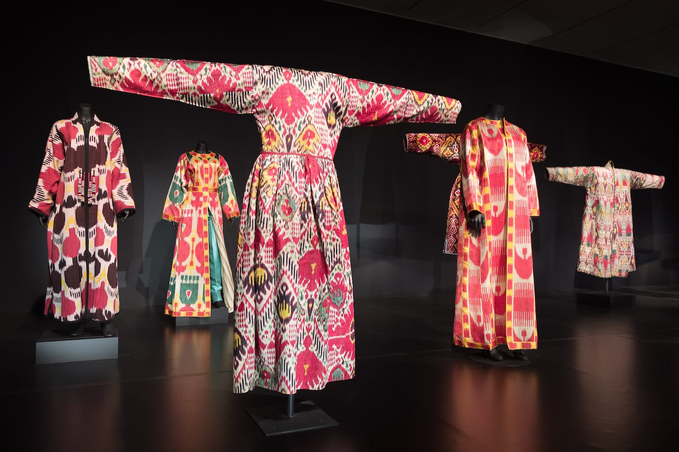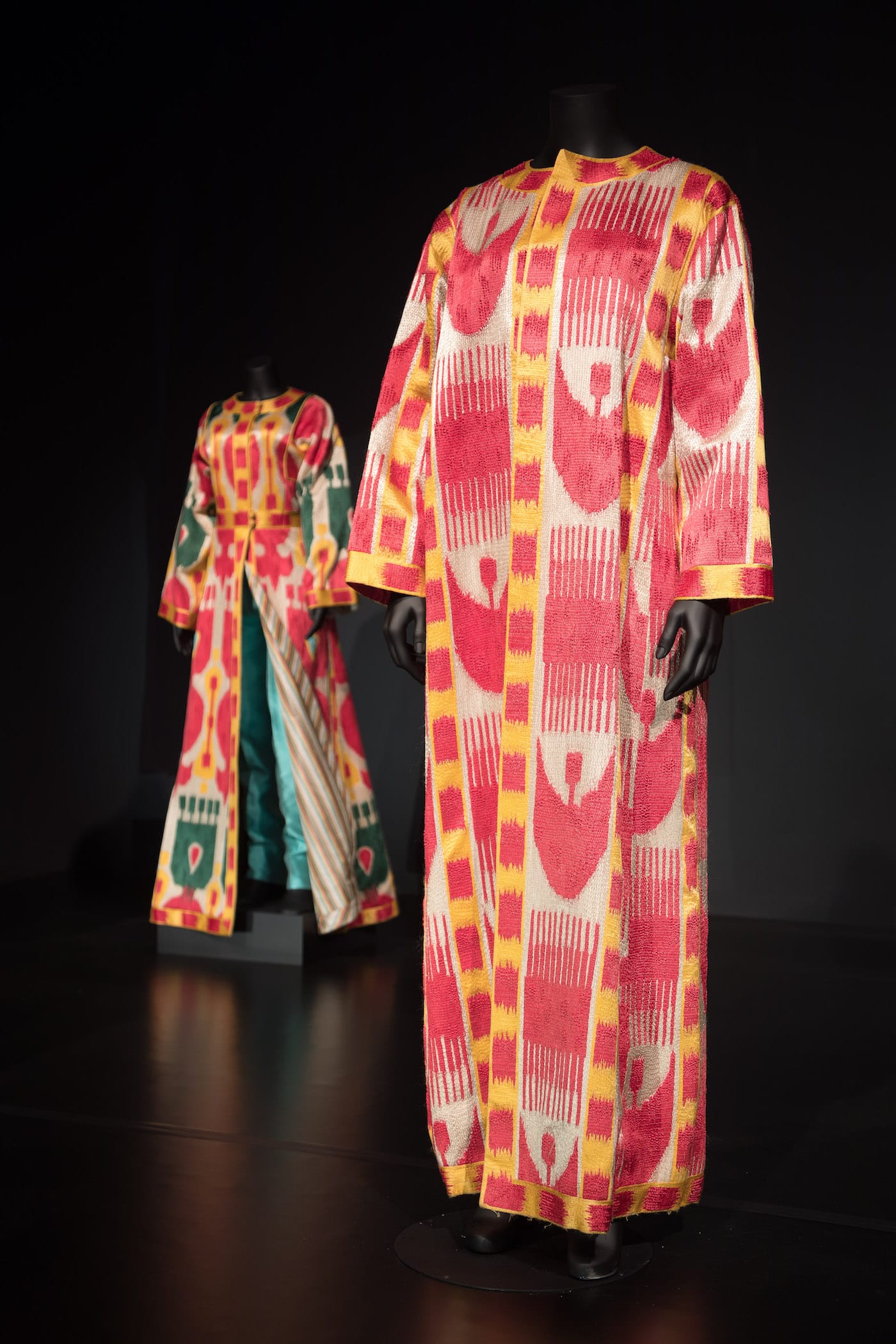 The impressive third room displays six de la Renta pieces interspersed with a roughly equal number of 19th-century ikat coats, all placed on mannequins. The effect of displaying them side by side is to make the Central Asian pieces more accessible and less foreign, and to underline the parallels between the two groups — all were considered luxurious and valuable in their time and place.
