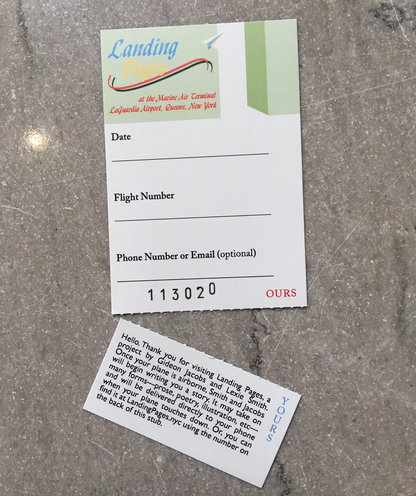 Through June 30, passengers traveling from LaGuardia Airport’s Marine Air Terminal (Terminal A) can visit the Landing Pages kiosk for a story. Each of these compact tales is written by Lexie Smith and Gideon Jacobs over the length of a traveler’s flight, and delivered to their phone upon landing.