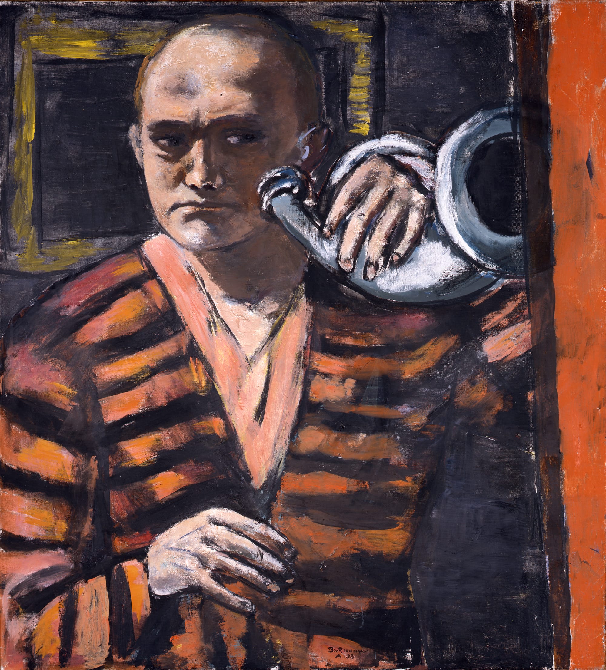 The exhibition’s “Individual” section features some standards of Neue Sachlichkeit portraiture, notably Otto Dix’s “Portrait of Johann Edwin Wolfensberger” (1929) and “Portrait of a Blonde Girl” (1932); Max Beckmann’s richly atmospheric “Self-Portrait with Horn” (1938), from the Neue Galerie’s collection, is also on display, but in the “Society” section.