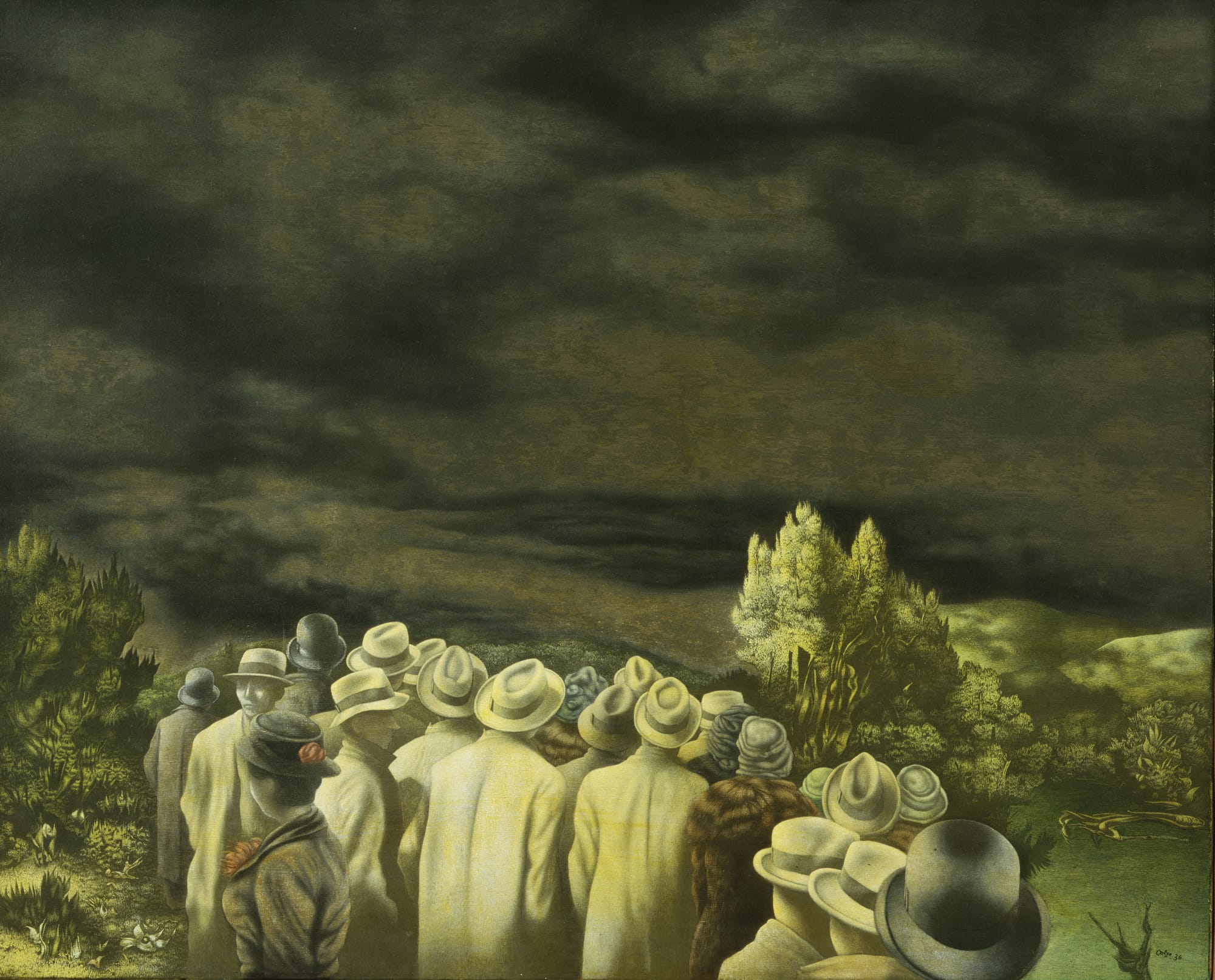 One of the exhibition’s key works, Richard Oelze’s “Expectation” (1935-36), in the “Landscape” section, speaks to this tendency and the artworks’ complex historical milieu. The painting depicts a crowd of people turned toward a forested landscape, loomed over by a heavy sky. Its greenish hue casts a film-noir shadow over the scene, but its mood is ambiguous, befitting its succinct title. A similar sense of uncertainty inflects many of the landscapes. Something sinister may reside in Hans Adolf Bühler’s “The Wild Forest” (c. 1937), with its bloody animal carcass at the center; clearly, Rudolf Schlichter’s cartoonish watercolor “Devil in the Forest” (c. 1933) depicts a threat.