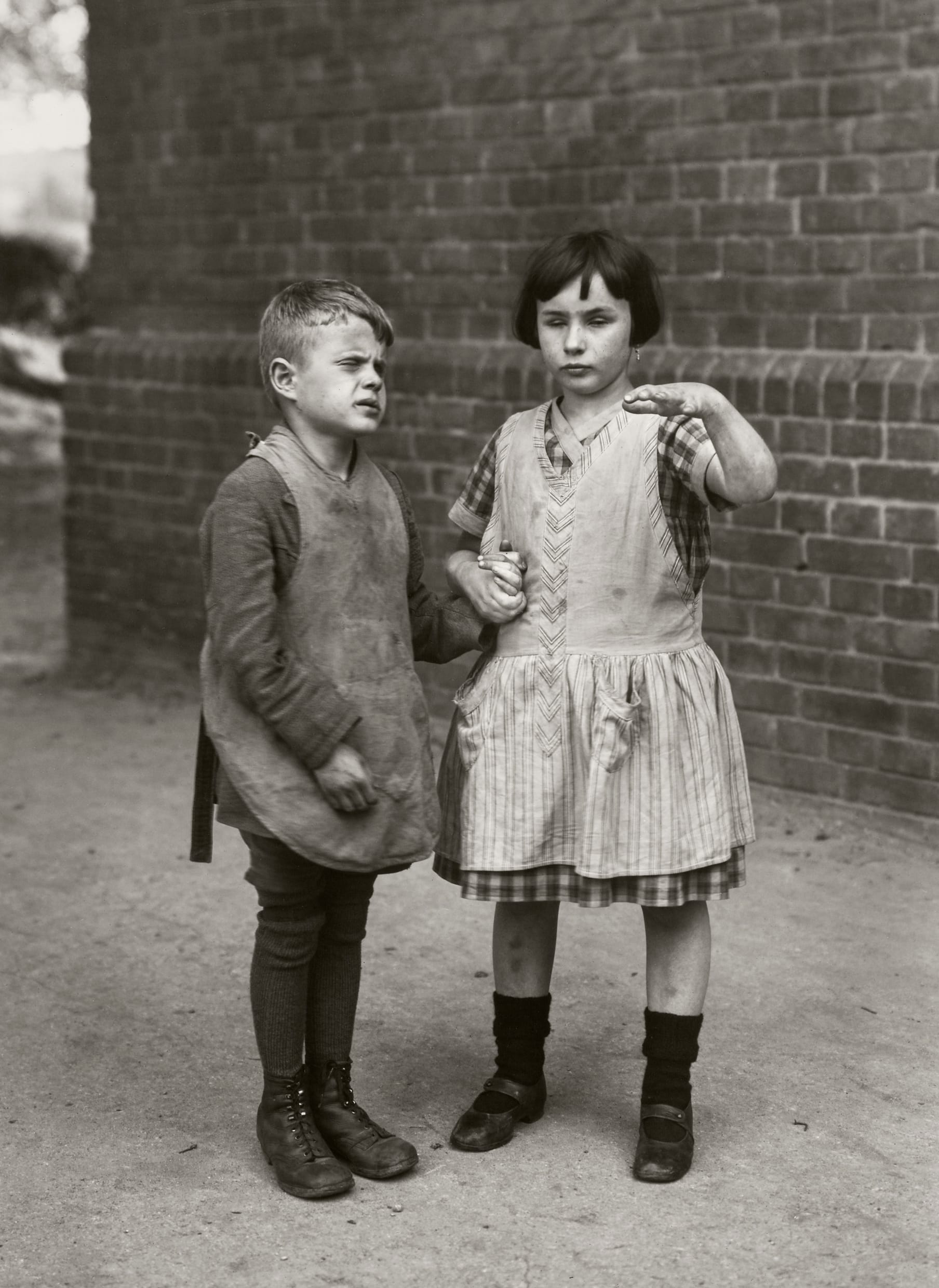 Blindness, allegorized in both Dicker-Brandeis’s and Scharl’s paintings, is literalized in August Sander’s photographs of blind men (“Blind People” and “Blind Miner and Blind Soldier,” both c. 1930) and a poignant photograph of a blind boy and girl holding hands (“Children Born Blind,” 1930-31). They represent what Sander called the “last people” — the disabled or dying. Part of his monumental People of the Twentieth Century series, here they hang alongside photographs of celebrities, uniformed Nazis, and Jewish men and women.