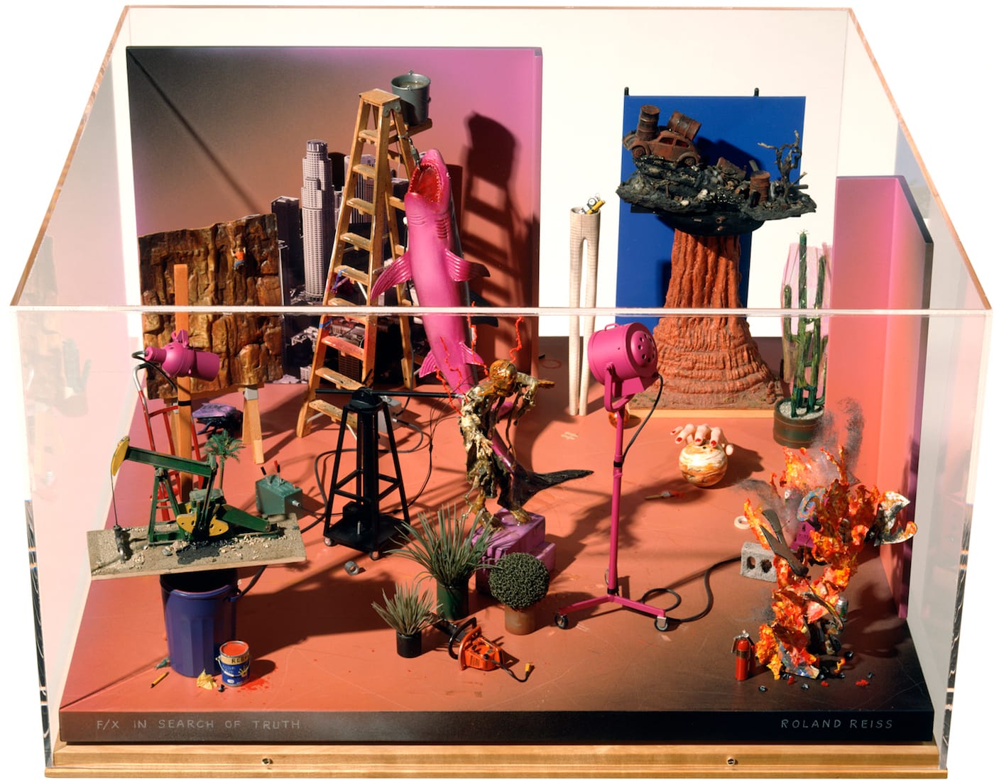 Reiss examines painting as a sculptural object; similarly, he examines sculpture from a painterly impulse, as an exploration of color. He is known for playing with scale, using cinematic framing and fracturing his narratives. The viewer peers into the miniaturize worlds of his dioramas like a giant voyeur, but looks directly at human-scale, in-your-face stylized flowers in his recent paintings, which critic James Scarborough writes are “not still lives but Vanitas painting for a digital age.”