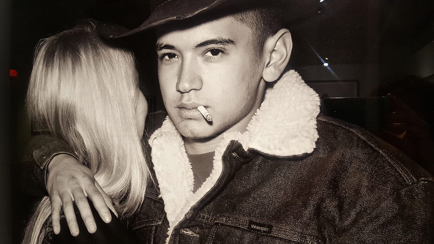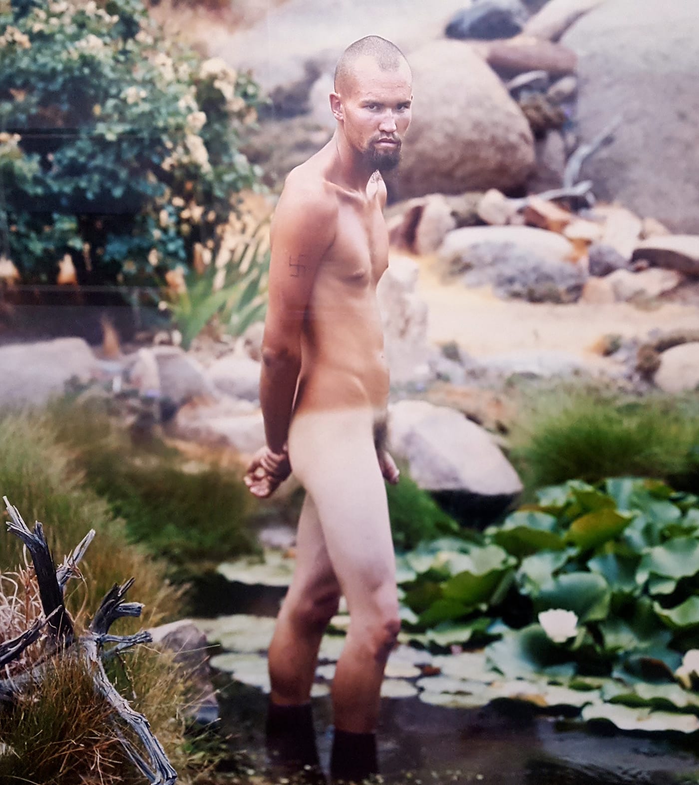 The commanding figure in this room is a lean and rather haunted-looking man, who stands naked, but for boots, in a lily pond, backed by breathtaking boulders and scrubby pine trees. He is a strange combination of grace and awkwardness — lithe and tan above the waste, with a stark tan line that reveals his preference for shorts in a glaringly white stretch of flesh from hip to knee. He seems comfortably naked, though not at ease with the camera, and vulnerable in a way particular to men who are naked but wearing shoes. On his upper arm, there is a homemade swastika tattoo. In this place, more or less at one with nature, it is the only symbol.