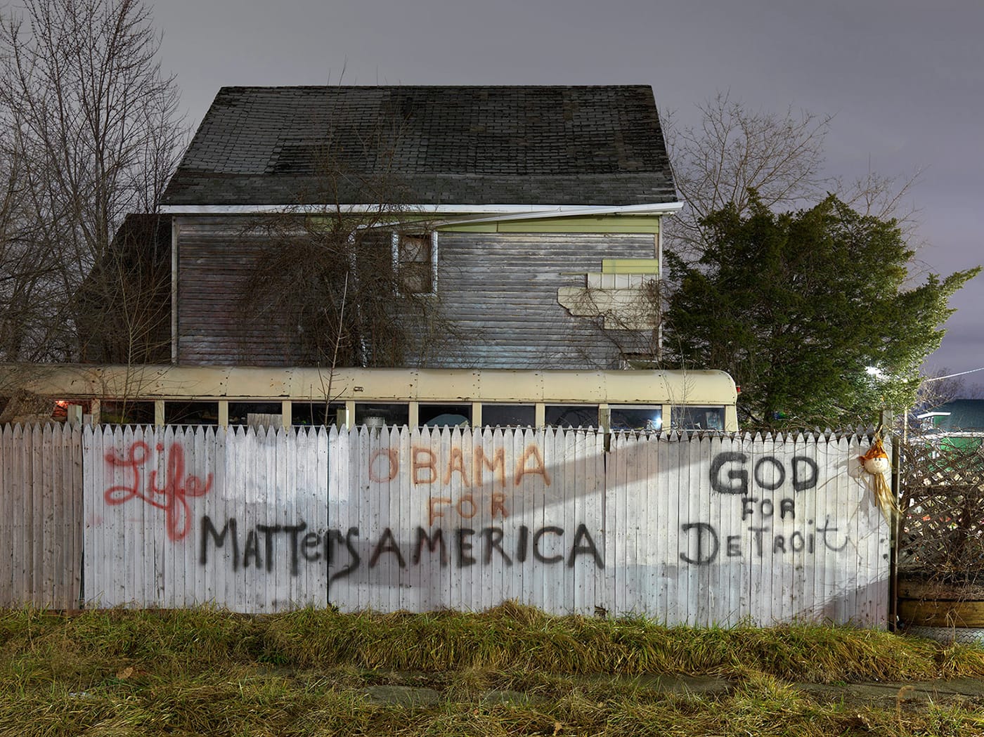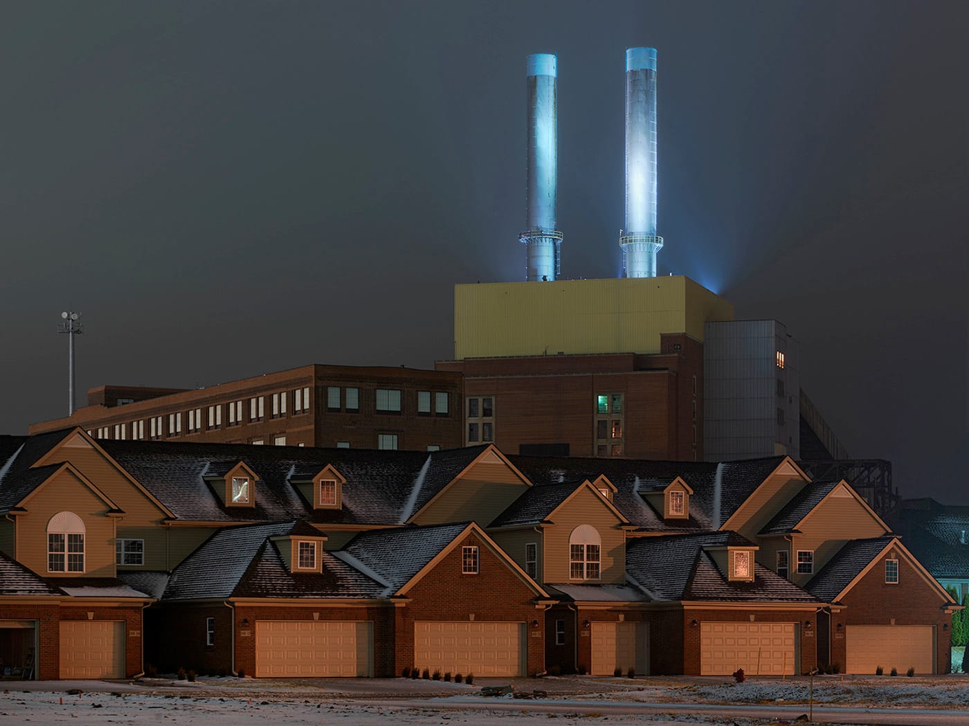 Just as many truths coexist here simultaneously, the paradoxical beauty of Detroit is in its sharp contrasts: the overgrown adjacent to the meticulously maintained; the preponderance of hand-painted signs that may or may not indicate the actual business in residence; a mural of a thriving community garden next to a snow-strewn vacant lot beneath a blazing McDonald’s sign; the hopeful and the despairing. In “Housing Development with Power Station, Eastside, Detroit” (2016), the brightly-lit smokestacks of the utility complex rise ignominiously above a row of cookie-cutter housing, which are being kissed by what looks like magic-hour orange light (but cannot be, based on the ash-gray conditions of the sky in the background). These foreground structures, which would be very much appropriate in a bland, suburban setting, take on a sense of the uncanny with the power plant looming in the background. These homes are dark, quiet, and have no cars in their driveways; it is possible they are entirely unoccupied.