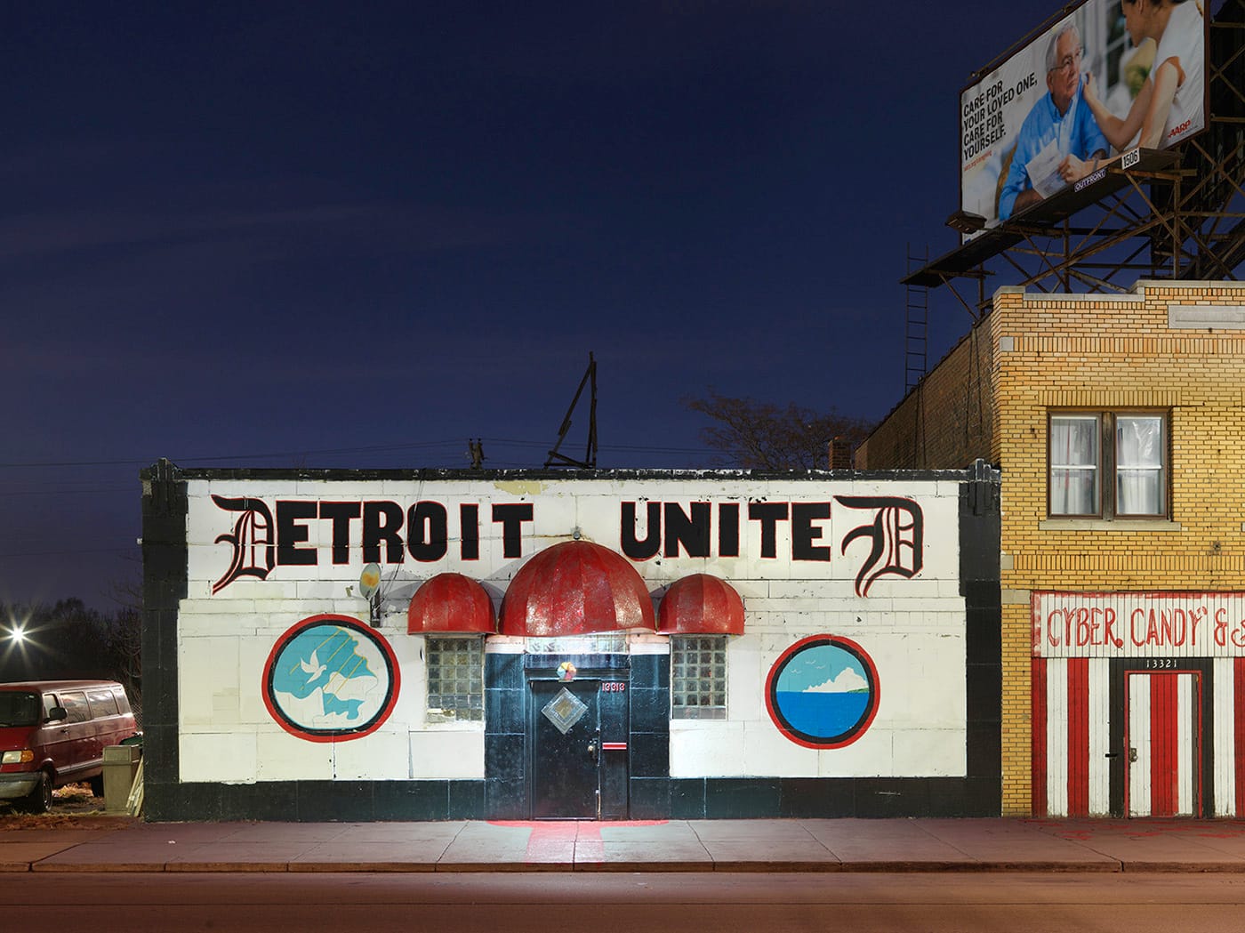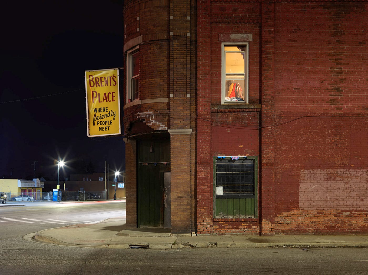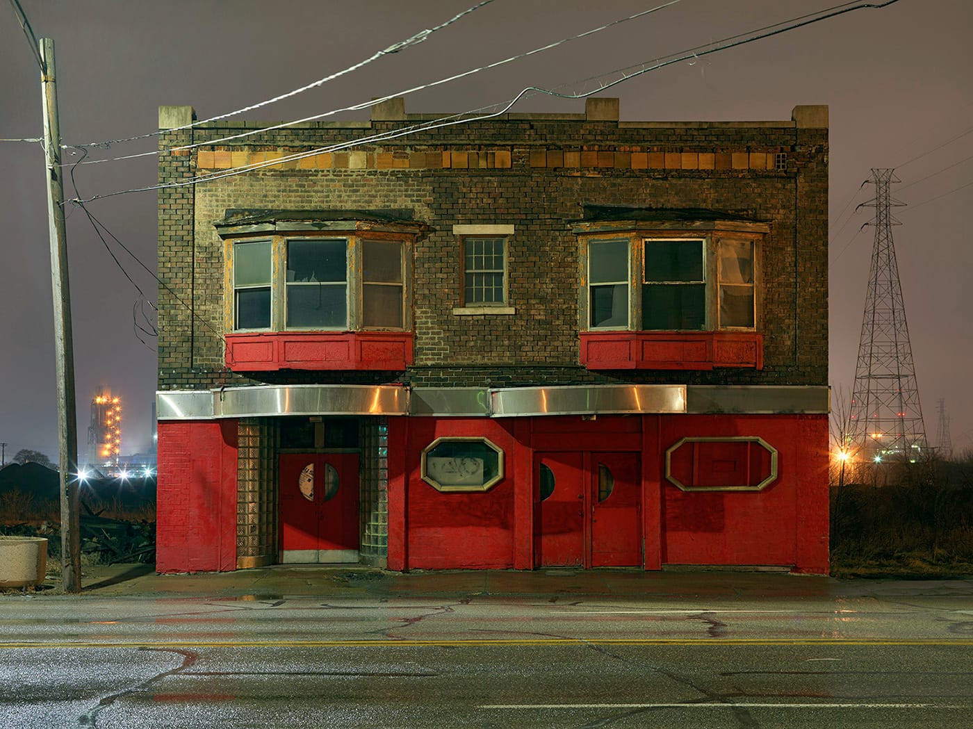 Jordano prefaces his images by quoting a passage from John Updike’s Trust Me: “But cities aren’t like people; they live on and on, even though their reason for being where they are has gone downriver and out to sea.” This quote is suggestive of a particular attitude held by some native Detroiters — perhaps especially particular to those who made their way out of the city during its nadir — that their city is gone and never coming back, that it is a city without direction or purpose. This is clearly not Jordano’s only take on Detroit — his previous six-year series, Detroit — Unbroken Down, presents sunlit and vital views of the city and its residents — but in a nocturnal mode, Jordano seems to dwell in the desolation, almost exclusively presenting selections in the book from his hundreds of nocturnal photos that are utterly devoid of people. Sometimes there is a lit window in the background, and in “Nightclub, West Chicago Street, Westside” (2017) a streak of red betrays the passing of taillights, but for the most part, there is no evidence that anyone remains in Detroit at all.