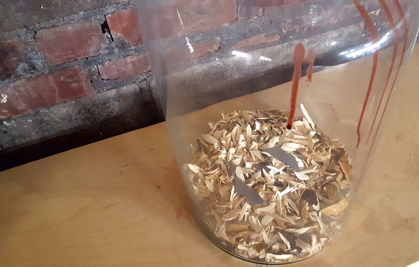 ‘Parent’ Ryan Lawless gave Gallagher a very specific set of instructions: the artist was to remove a branch from the tree nearest his bedroom from his childhood home, two to three inches in diameter and 30 inches long, then whittle the entire branch into one-inch shavings with a sharp knife in a single sitting, filming the entire process. Finally, Gallagher needed to collect the shavings for display alongside the film. This edict playfully combined the DIY trappings of the “Handy Dad” aesthetic, the idea of drawing from personal history, and the “wax-on, wax-off” notion of mentorship by a process of tedious physical repetition. Gallagher clearly struggles with the task of whittling in the 2 hours, 21-min video, and the shavings are displayed in a large decorative glass vase that also features several long drips of the artist’s blood, produced during the making process.