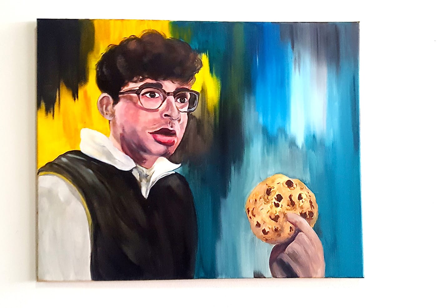 The really fascinating part of Parent Project is not, ultimately, any individual work, although I confess I can’t stop thinking about Angie Davis’s portrait of a young Rick Moranis holding a chocolate-chip cookie with an awestruck disposition, somehow arrived at in response to Sean Maxwell’s instructions that Davis read the first two chapters and the last two chapters of the most frequently checked out books in her hometown’s library, and then write the middle two chapters to connect them. What stands out amid this collection of projects is the notion of a step-by-step instruction manual for young artists.