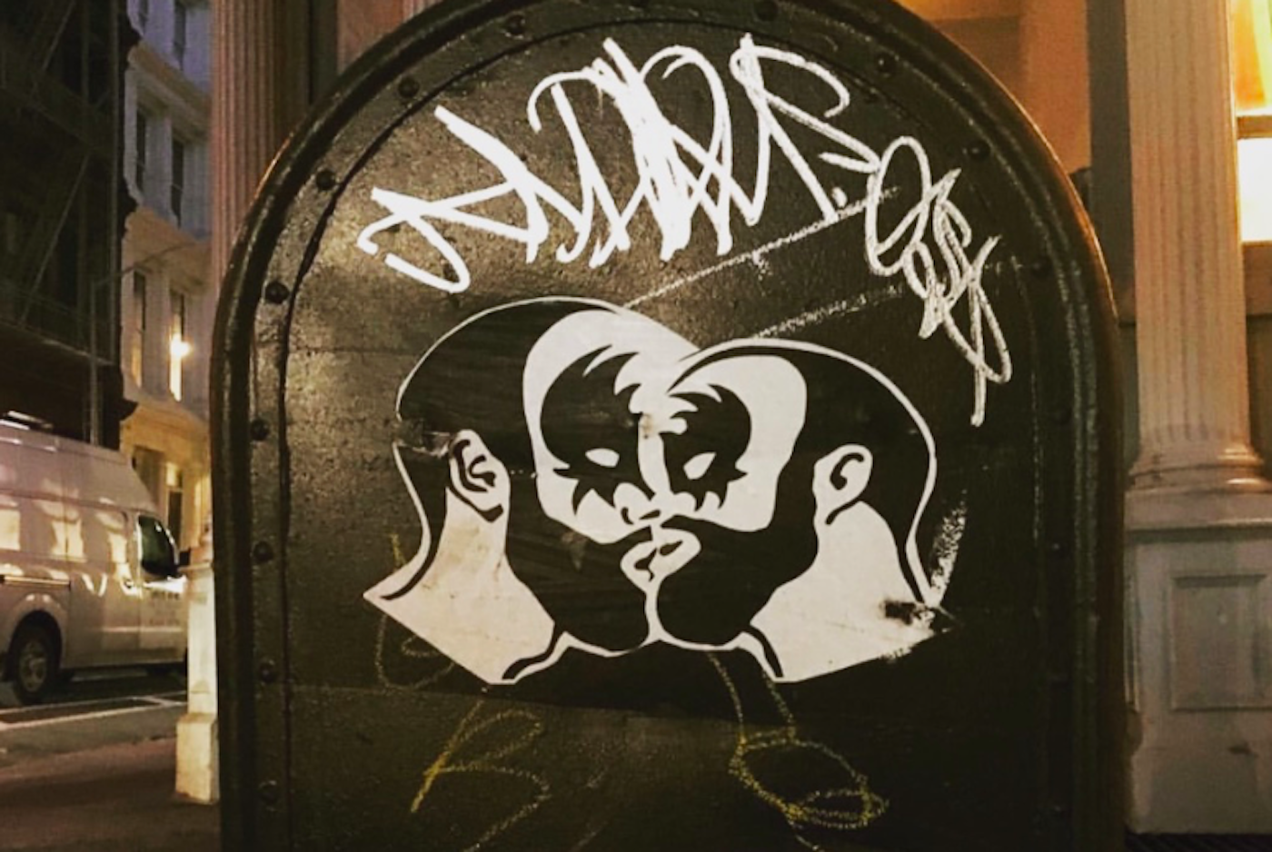 In addition to being an artist, Novy has also become a historian of the movement. In 2011, he received funding from the National Endowment for the Arts and the San Francisco Arts Commission for his self-curated exhibition, A History of Queer Street Art. Novy has spent an enormous amount of time documenting the unofficial founding members of today’s burgeoning movement, like Keith Haring, who passed away from AIDS in 1990 at the age of 31. Haring is often celebrated for his black-and-white chalk drawings and painted murals that notably appeared on New York City subway walls. But Novy and others are working to promote the queer themes of his work, which were often commissioned by private citizens or ignored by the mainstream art world.