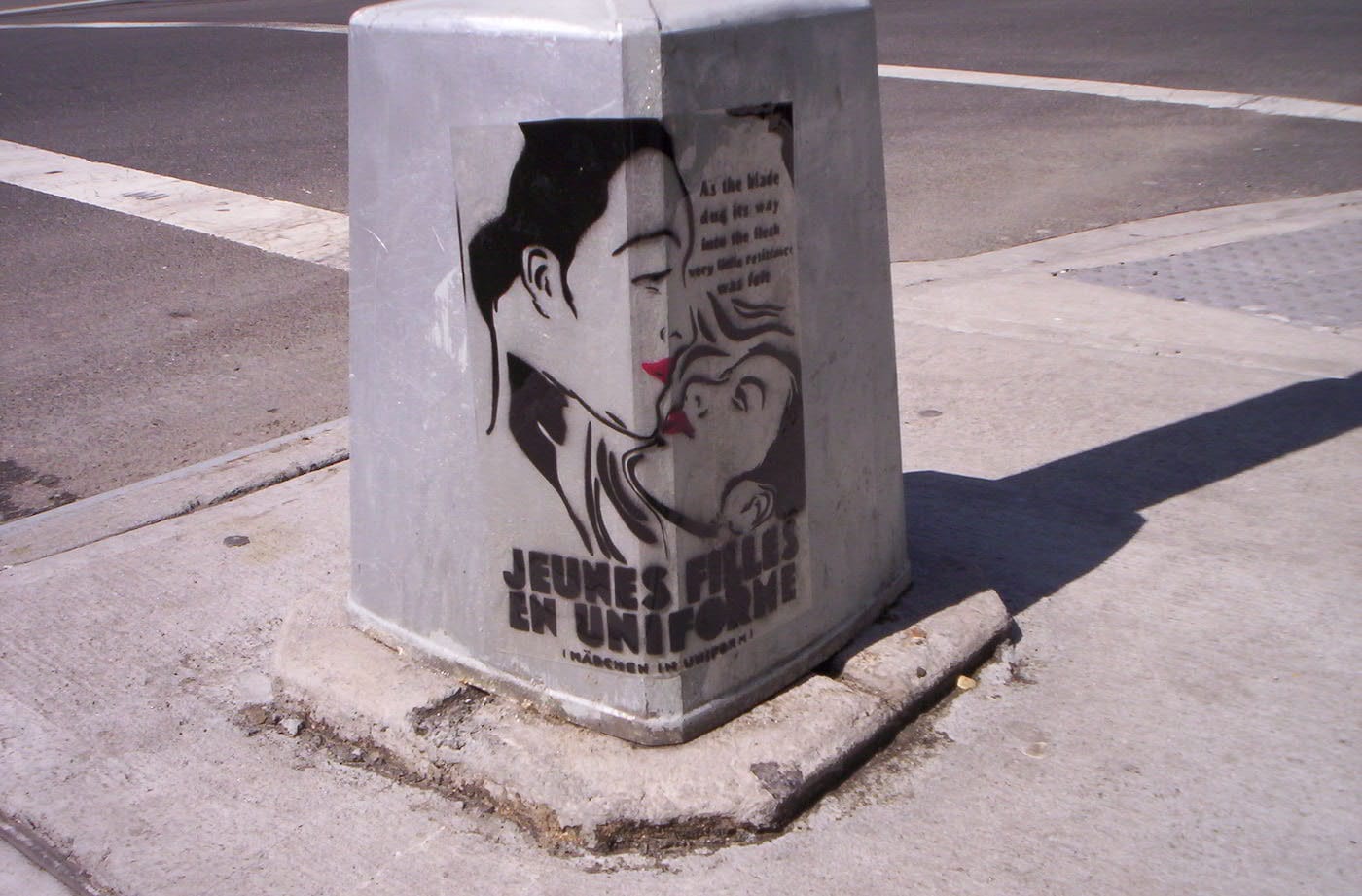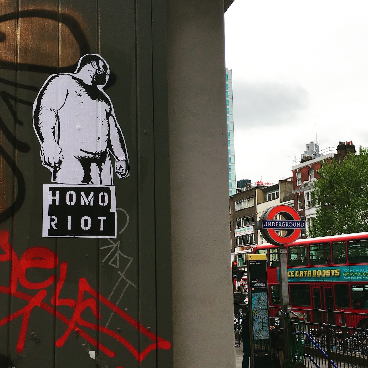 Another Los Angeles-based, queer street artist, Homo Riot, has noted that in the past this type of artwork was also a way to give the middle finger to a society that has long policed and punished gay culture. By putting a queer image — such as a sticker of two male wrestlers kissing — on some public object, Homo Riot confronted the people in power who, for many years, largely remained unsupportive of gay rights.