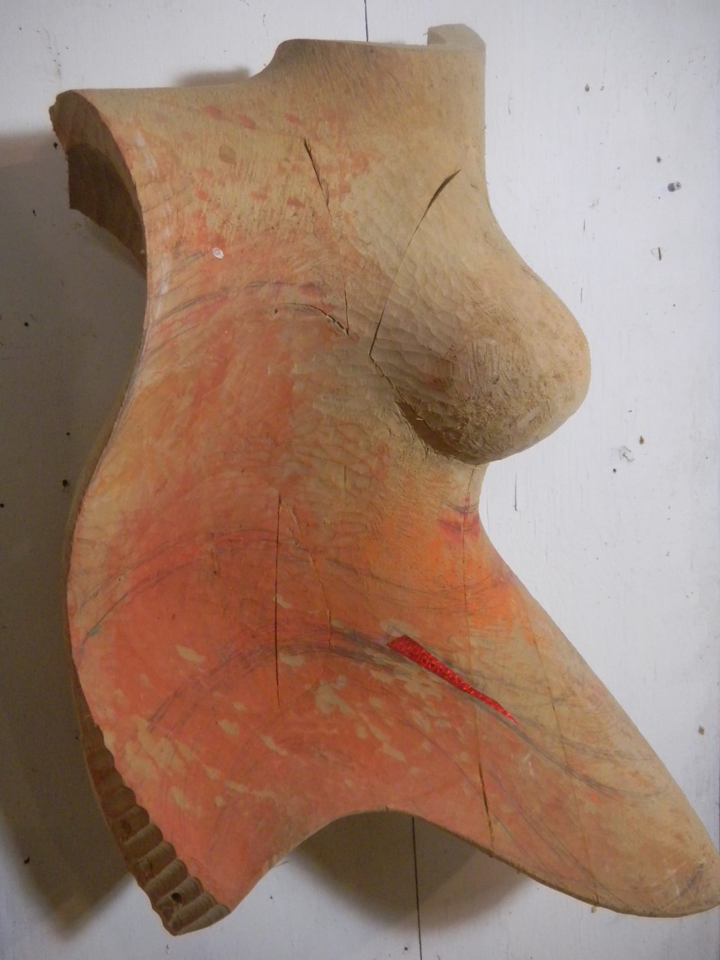 Fred focused on a small, irregularly shaped work. Other than pencil lines, colored chalk, chisel marks, scratches, and sandings, it was composed of a convex, breast-like form sloping into a concavity, crating an undulating surface across a warped wooden plane. Was it a markedly physical painting or drawing, or a flat(ish) sculpture? Take your pick.